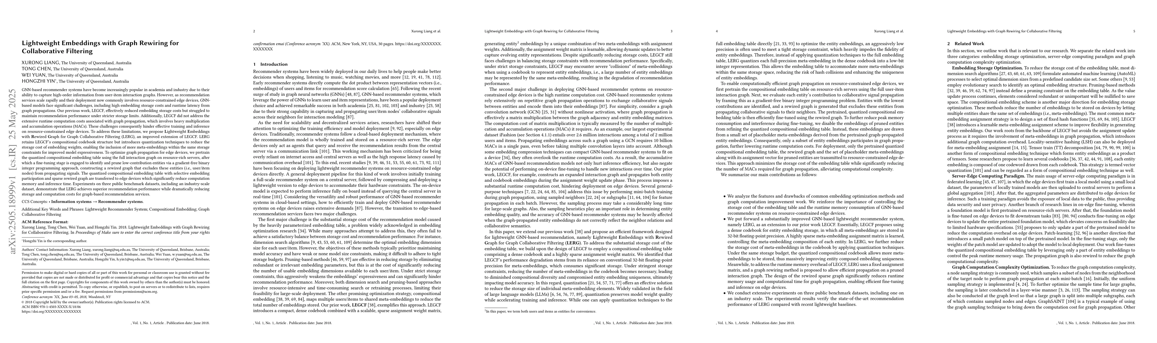 This research proposes Lightweight Embeddings with Graph Rewiring for Collaborative Filtering to improve recommendation systems on resource-constrained edge devices by reducing storage costs and runtime latency.