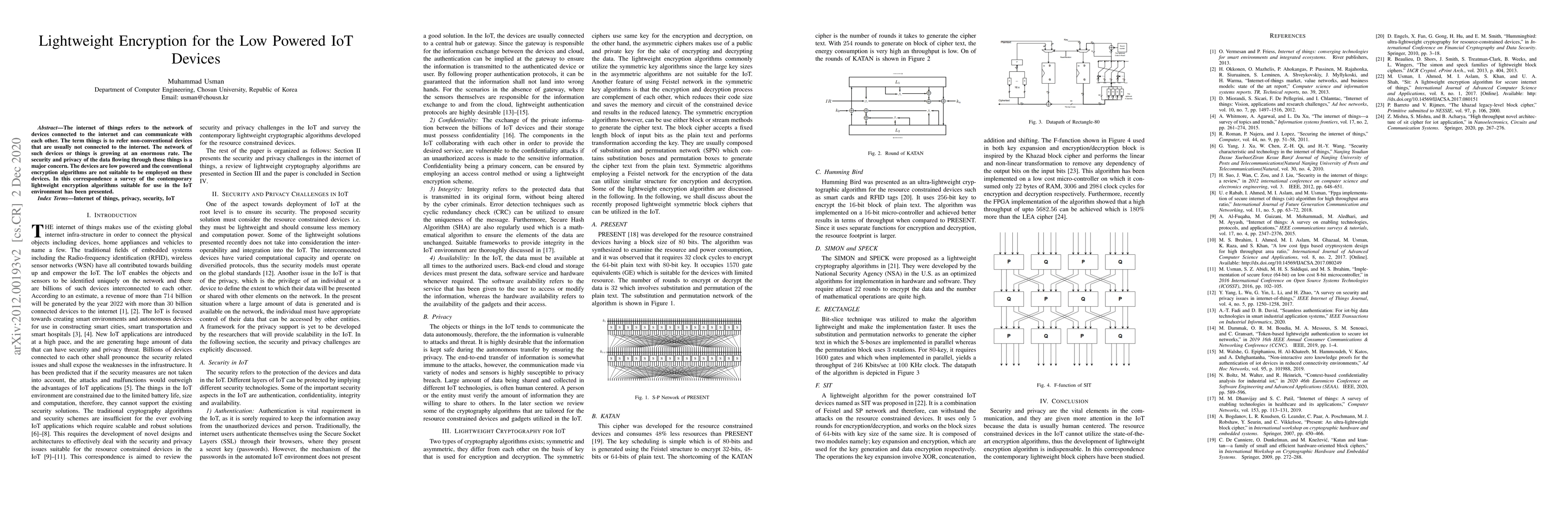 This paper surveys contemporary lightweight encryption algorithms tailored for low-powered IoT devices, addressing the security and privacy concerns of data flowing through non-conventional, internet-connected devices. It highlights the inefficiency of conventional encryption methods for such resource-constrained environments.