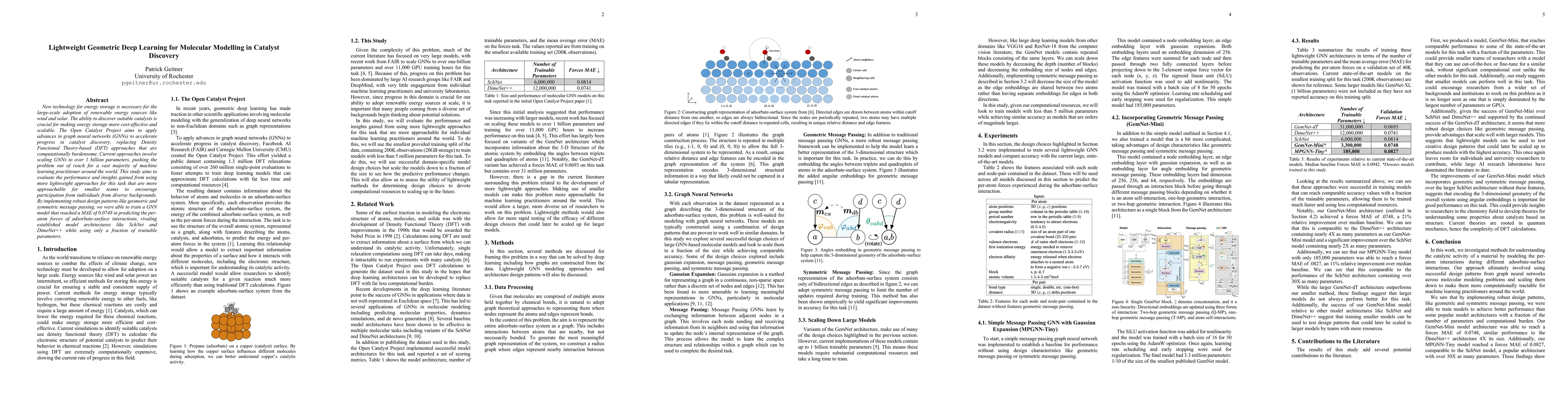 This research proposes lightweight geometric deep learning techniques, specifically graph neural networks (GNNs), for efficient catalyst discovery in energy storage, achieving competitive results with significantly fewer parameters compared to traditional models, thus making the technology more accessible for diverse teams. The study demonstrates a model with robust design patterns achieving an MAE of 0.0748 in predicting per-atom forces, rivaling established architectures.