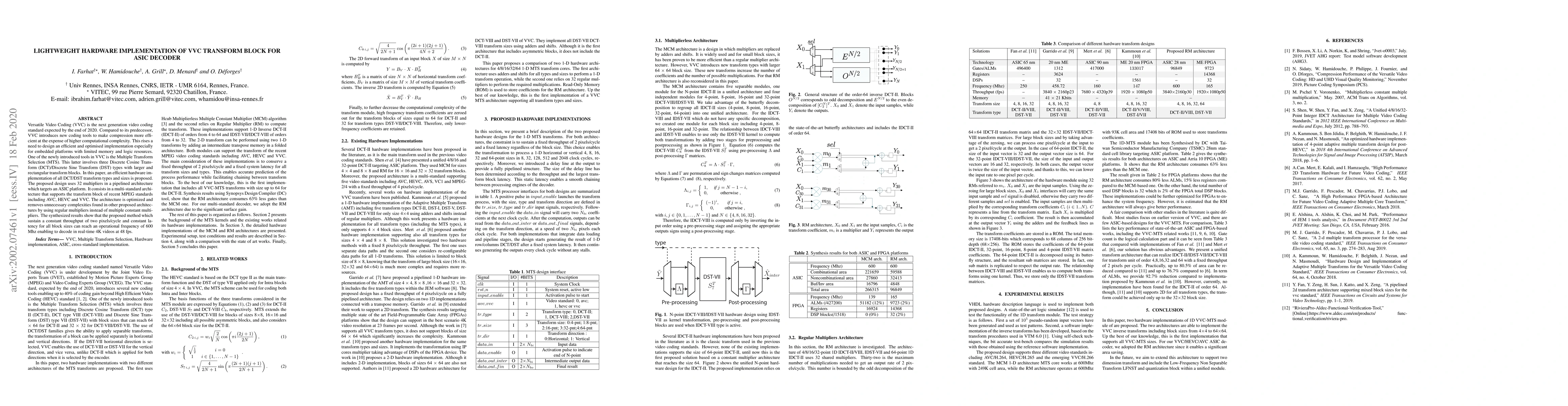This paper proposes an efficient lightweight hardware implementation of VVC transform blocks for an ASIC decoder, focusing on optimizing computational complexity and resource usage. The design achieves a constant throughput of two pixels/cycle and a latency for all block sizes, enabling real-time 4K video decoding at 48 fps at an operational frequency of 600 MHz.
