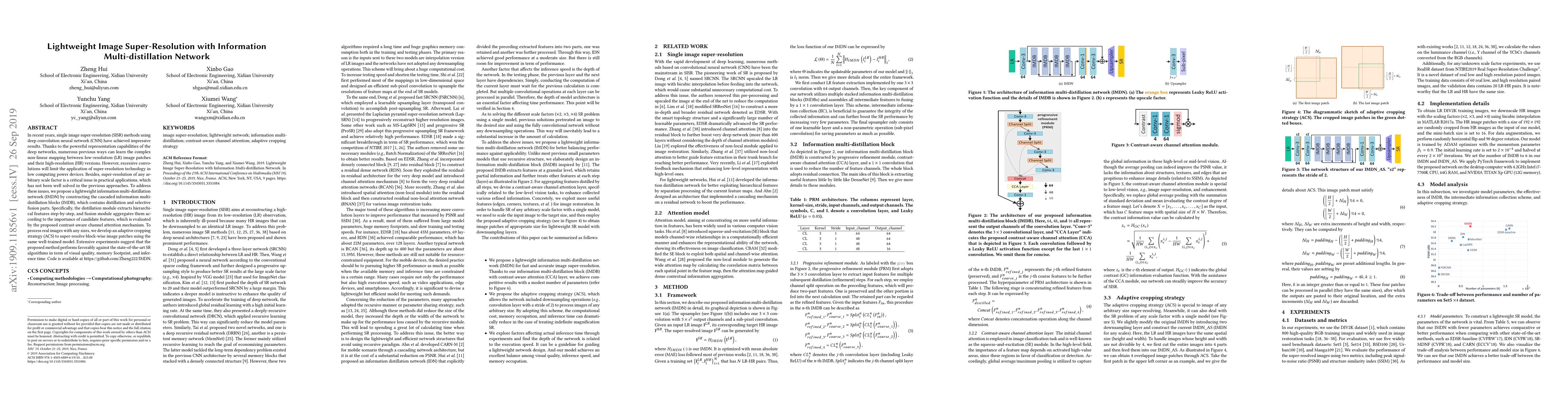 This paper proposes a lightweight information multi-distillation network (IMDN) for efficient image super-resolution, addressing the limitations of excessive convolutions and arbitrary scale factors. The IMDN uses cascaded distillation blocks with selective fusion and an adaptive cropping strategy for real-time processing.