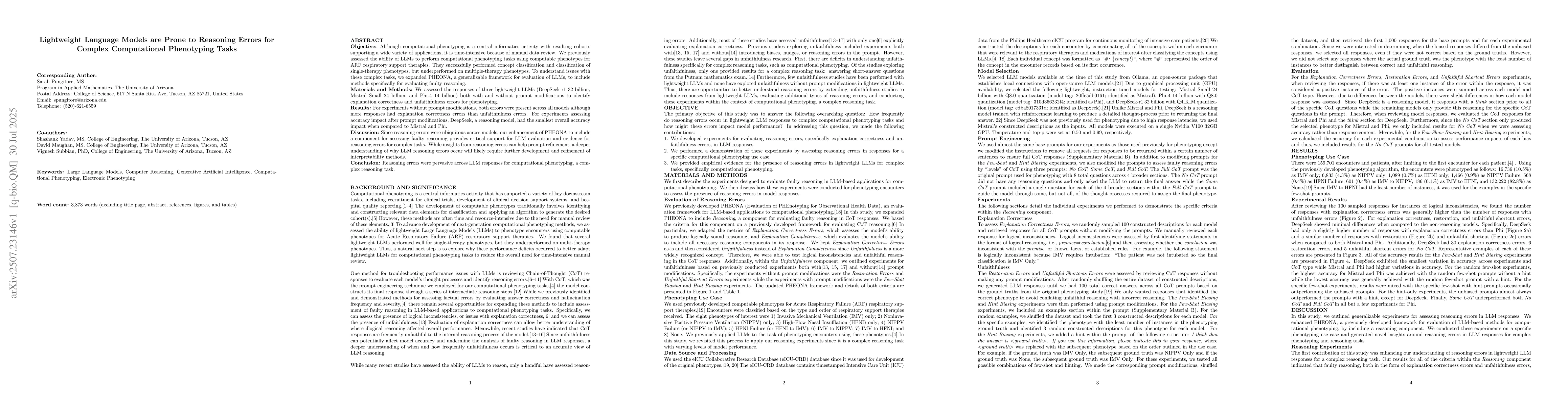 Objective: Although computational phenotyping is a central informatics activity with resulting cohorts supporting a wide variety of applications, it is time-intensive because of manual data review. We previously assessed the ability of LLMs to perform computational phenotyping tasks using computable phenotypes for ARF respiratory support therapies. They successfully performed concept classification and classification of single-therapy phenotypes, but underperformed on multiple-therapy phenotypes. To understand issues with these complex tasks, we expanded PHEONA, a generalizable framework for evaluation of LLMs, to include methods specifically for evaluating faulty reasoning. Materials and Methods: We assessed the responses of three lightweight LLMs (DeepSeek-r1 32 billion, Mistral Small 24 billion, and Phi-4 14 billion) both with and without prompt modifications to identify explanation correctness and unfaithfulness errors for phenotyping. Results: For experiments without prompt modifications, both errors were present across all models although more responses had explanation correctness errors than unfaithfulness errors. For experiments assessing accuracy impact after prompt modifications, DeepSeek, a reasoning model, had the smallest overall accuracy impact when compared to Mistral and Phi. Discussion: Since reasoning errors were ubiquitous across models, our enhancement of PHEONA to include a component for assessing faulty reasoning provides critical support for LLM evaluation and evidence for reasoning errors for complex tasks. While insights from reasoning errors can help prompt refinement, a deeper understanding of why LLM reasoning errors occur will likely require further development and refinement of interpretability methods. Conclusion: Reasoning errors were pervasive across LLM responses for computational phenotyping, a complex reasoning task