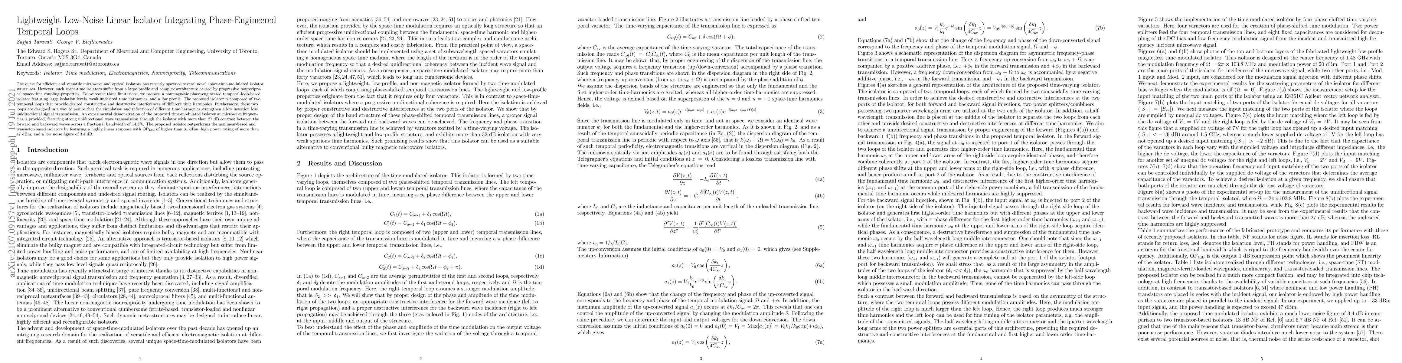 This paper proposes a lightweight, low-noise, phase-engineered temporal-loop-based isolator for microwave and optical applications, achieving large isolation and low insertion loss with minimal time harmonics. Experimental results demonstrate superior performance compared to existing nonlinear and transistor-based isolators.
