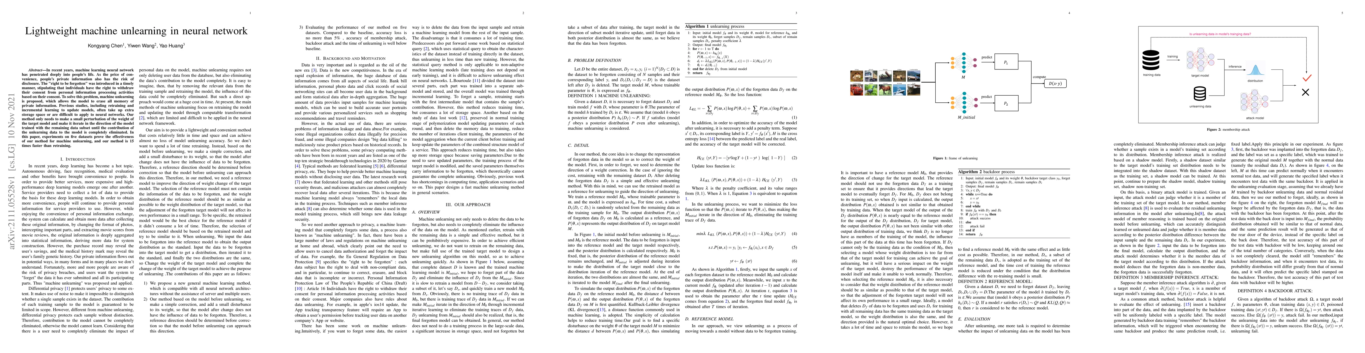 This paper proposes a lightweight machine unlearning method for neural networks that efficiently erases private information from the model without requiring extensive retraining or additional storage. Experiments show the method is 15 times faster than traditional retraining, effectively eliminating the contribution of unlearning data.