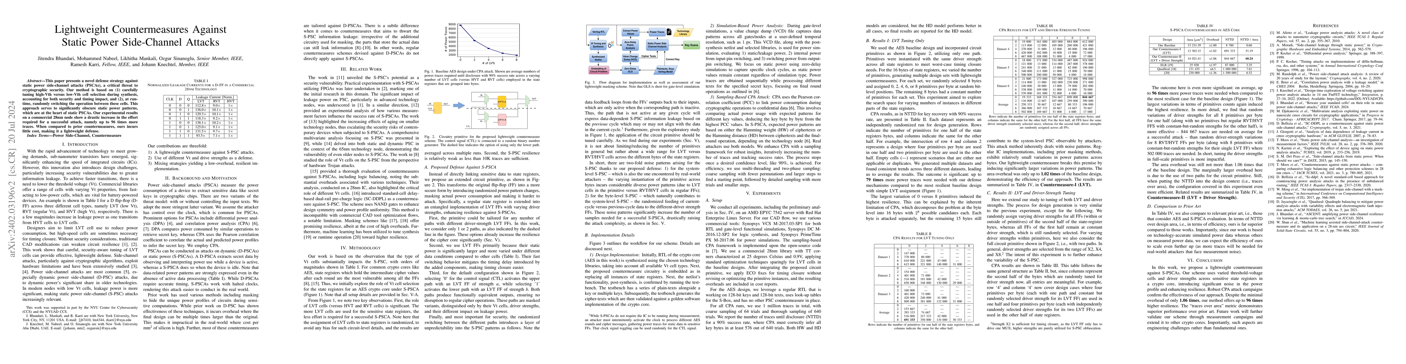 This paper introduces a lightweight defense against static power side-channel attacks by tuning high-Vth versus low-Vth cell selection during synthesis and randomly switching operations at runtime, significantly increasing attack effort by up to 96 times while incurring minimal cost.