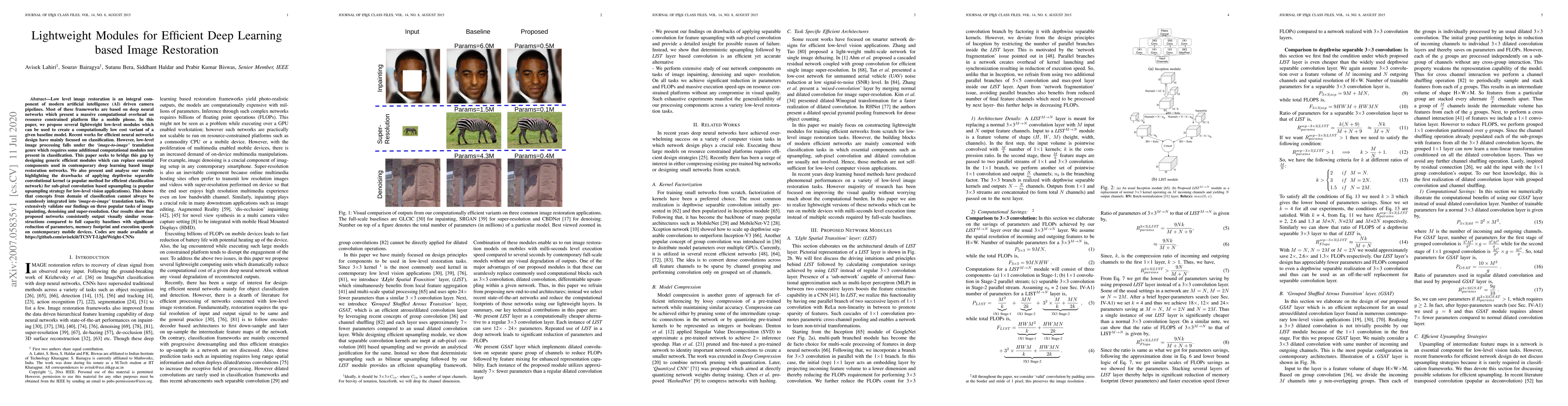 Low level image restoration is an integral component of modern artificial intelligence (AI) driven camera pipelines. Most of these frameworks are based on deep neural networks which present a massive computational overhead on resource constrained platform like a mobile phone. In this paper, we propose several lightweight low-level modules which can be used to create a computationally low cost variant of a given baseline model. Recent works for efficient neural networks design have mainly focused on classification. However, low-level image processing falls under the image-to-image' translation genre which requires some additional computational modules not present in classification. This paper seeks to bridge this gap by designing generic efficient modules which can replace essential components used in contemporary deep learning based image restoration networks. We also present and analyse our results highlighting the drawbacks of applying depthwise separable convolutional kernel (a popular method for efficient classification network) for sub-pixel convolution based upsampling (a popular upsampling strategy for low-level vision applications). This shows that concepts from domain of classification cannot always be seamlessly integrated into image-to-image translation tasks. We extensively validate our findings on three popular tasks of image inpainting, denoising and super-resolution. Our results show that proposed networks consistently output visually similar reconstructions compared to full capacity baselines with significant reduction of parameters, memory footprint and execution speeds on contemporary mobile devices.