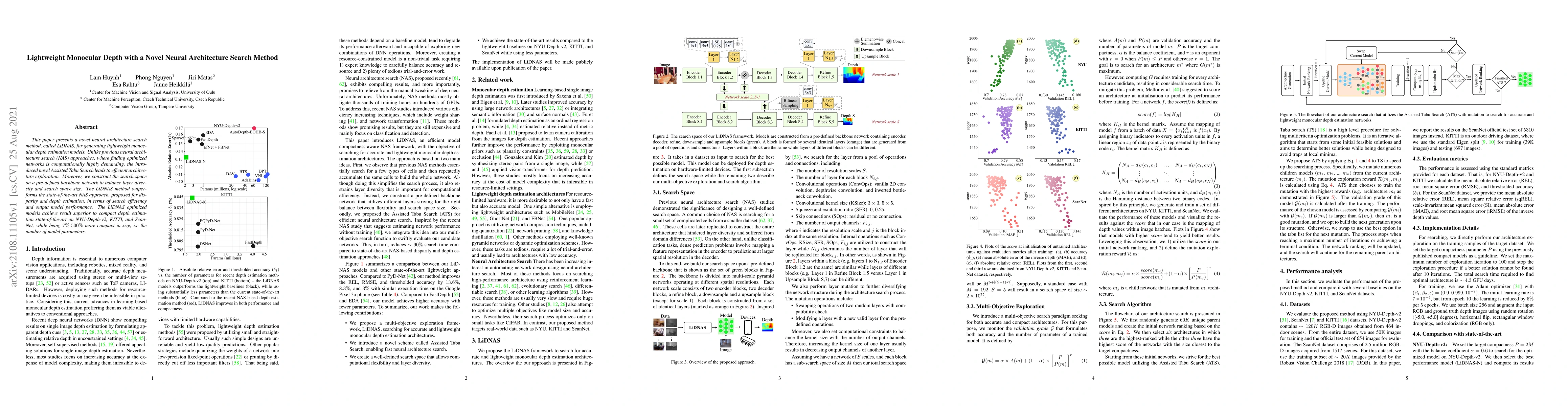 This paper introduces LiDNAS, a novel neural architecture search method for efficient lightweight monocular depth estimation models, achieving superior performance and compactness compared to existing approaches. The Assisted Tabu Search and predefined backbone network enable both search efficiency and high-quality depth estimation results.