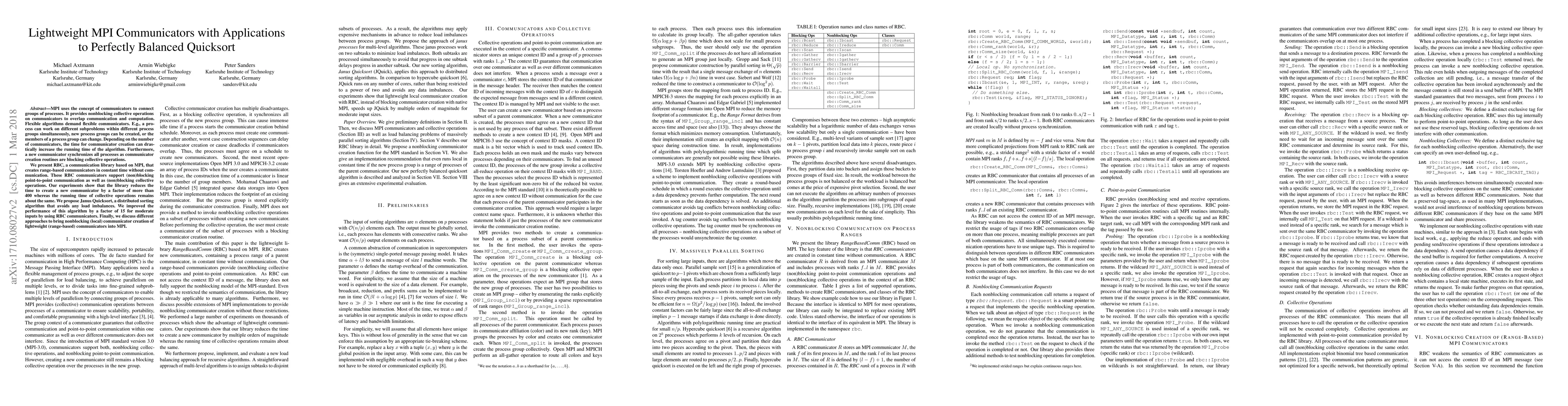 This paper introduces RBC, a lightweight MPI communicator library that creates range-based communicators in constant time, significantly reducing communicator creation time by over 400 times. The authors demonstrate improved performance of Janus Quicksort, a distributed sorting algorithm, by a factor of 15 using RBC communicators.