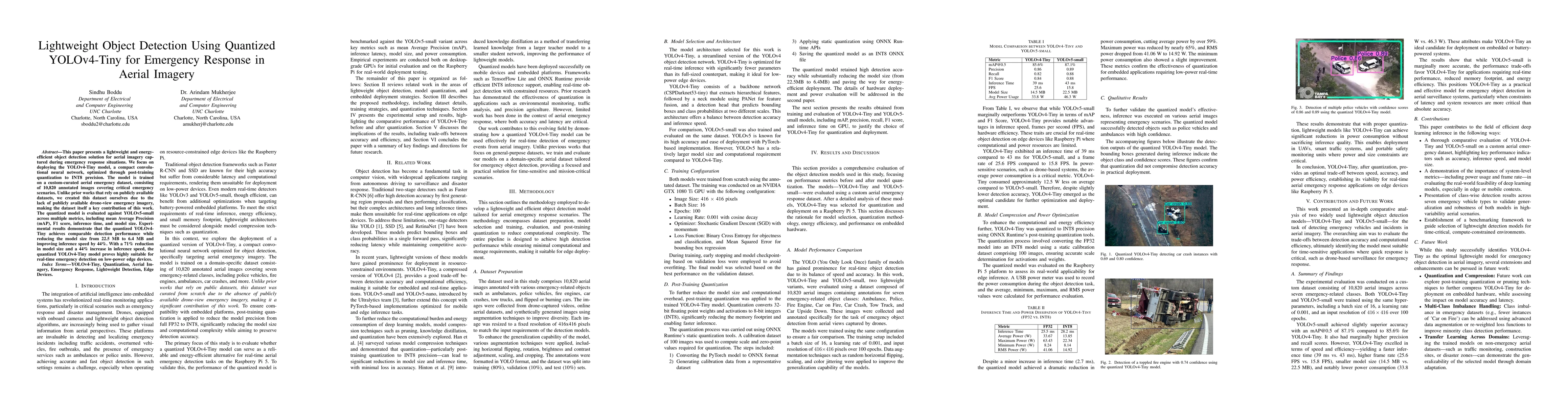 A lightweight object detection model, YOLOv4-Tiny, is proposed for emergency response in aerial imagery with a 71% reduction in size and a 44% increase in inference speed.