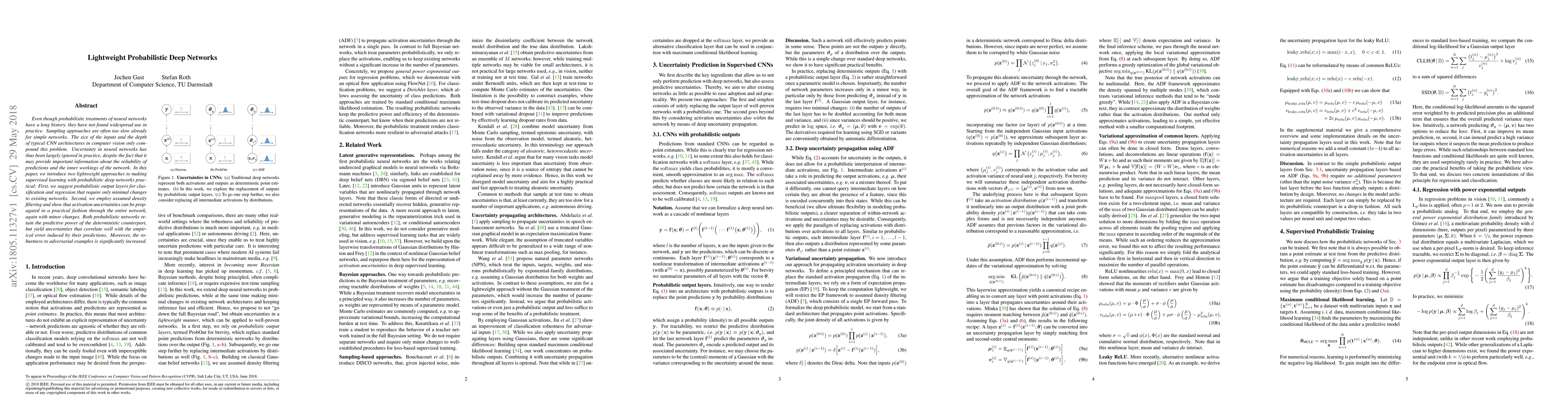 This paper proposes lightweight probabilistic deep networks that enable practical use of uncertainty in neural networks. It introduces minimal modifications to existing networks through probabilistic output layers and assumed density filtering, which propagate activation uncertainties efficiently and enhance robustness to adversarial examples while maintaining predictive power.