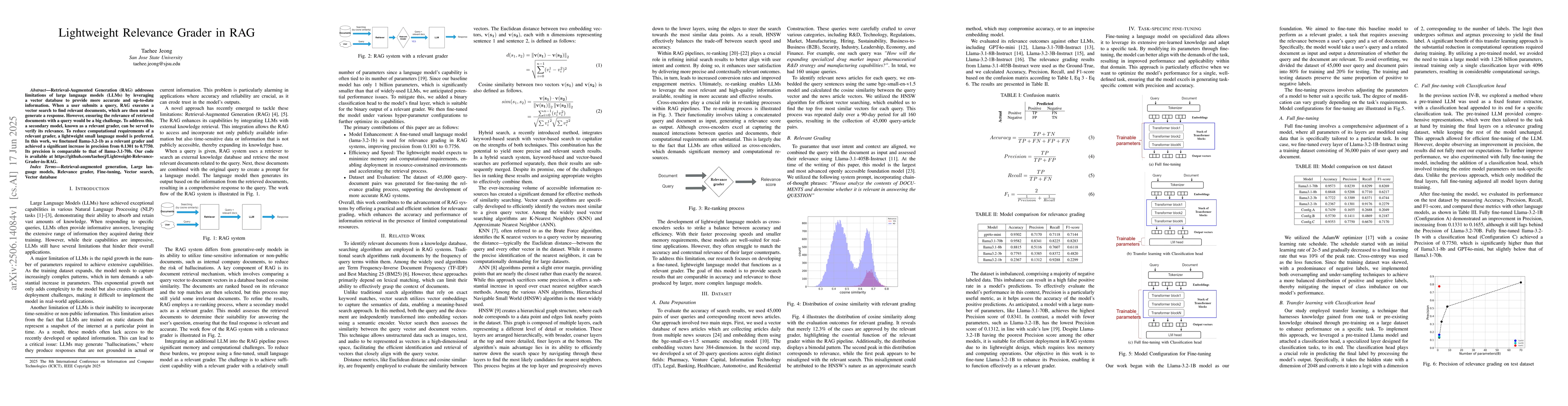 Retrieval-Augmented Generation (RAG) addresses limitations of large language models (LLMs) by leveraging a vector database to provide more accurate and up-to-date information. When a user submits a query, RAG executes a vector search to find relevant documents, which are then used to generate a response. However, ensuring the relevance of retrieved documents with a query would be a big challenge. To address this, a secondary model, known as a relevant grader, can be served to verify its relevance. To reduce computational requirements of a relevant grader, a lightweight small language model is preferred. In this work, we finetuned llama-3.2-1b as a relevant grader and achieved a significant increase in precision from 0.1301 to 0.7750. Its precision is comparable to that of llama-3.1-70b. Our code is available at https://github.com/taeheej/Lightweight-Relevance-Grader-in-RAG.