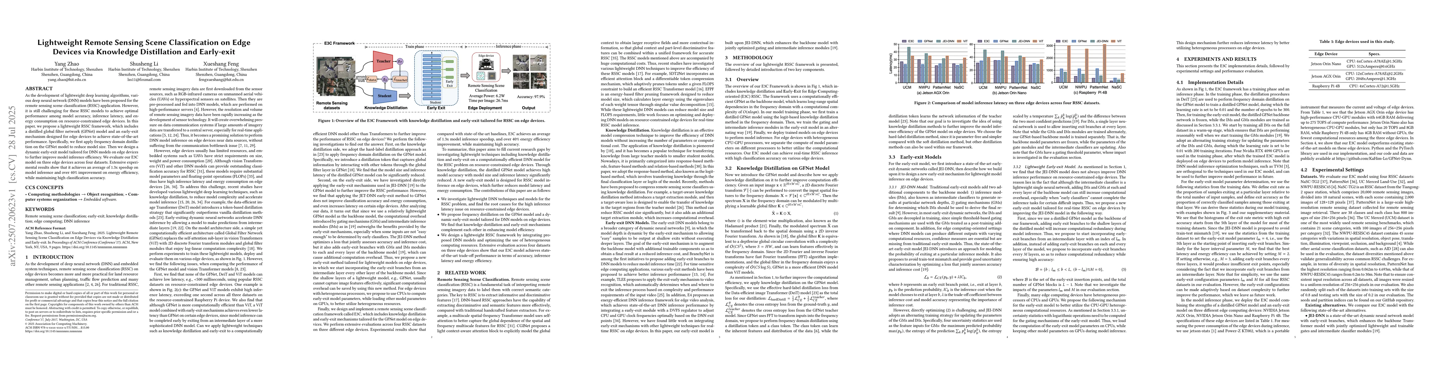 As the development of lightweight deep learning algorithms, various deep neural network (DNN) models have been proposed for the remote sensing scene classification (RSSC) application. However, it is still challenging for these RSSC models to achieve optimal performance among model accuracy, inference latency, and energy consumption on resource-constrained edge devices. In this paper, we propose a lightweight RSSC framework, which includes a distilled global filter network (GFNet) model and an early-exit mechanism designed for edge devices to achieve state-of-the-art performance. Specifically, we first apply frequency domain distillation on the GFNet model to reduce model size. Then we design a dynamic early-exit model tailored for DNN models on edge devices to further improve model inference efficiency. We evaluate our E3C model on three edge devices across four datasets. Extensive experimental results show that it achieves an average of 1.3x speedup on model inference and over 40% improvement on energy efficiency, while maintaining high classification accuracy.