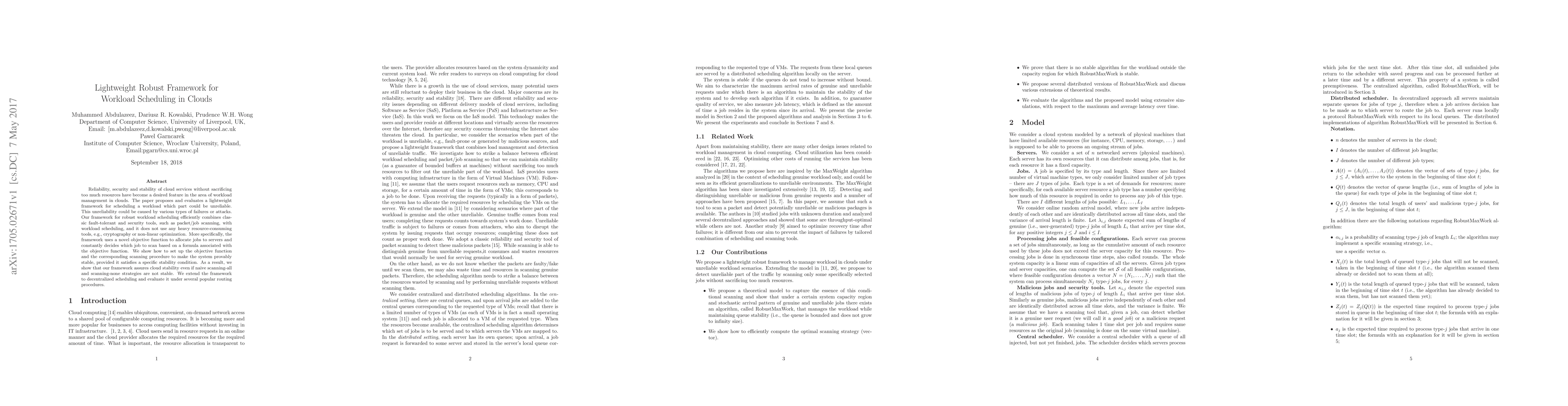 Reliability, security and stability of cloud services without sacrificing too much resources have become a desired feature in the area of workload management in clouds. The paper proposes and evaluates a lightweight framework for scheduling a workload which part could be unreliable. This unreliability could be caused by various types of failures or attacks. Our framework for robust workload scheduling efficiently combines classic fault-tolerant and security tools, such as packet/job scanning, with workload scheduling, and it does not use any heavy resource-consuming tools, e.g., cryptography or non-linear optimization. More specifically, the framework uses a novel objective function to allocate jobs to servers and constantly decides which job to scan based on a formula associated with the objective function. We show how to set up the objective function and the corresponding scanning procedure to make the system provably stable, provided it satisfies a specific stability condition. As a result, we show that our framework assures cloud stability even if naive scanning-all and scanning-none strategies are not stable. We extend the framework to decentralized scheduling and evaluate it under several popular routing procedures.