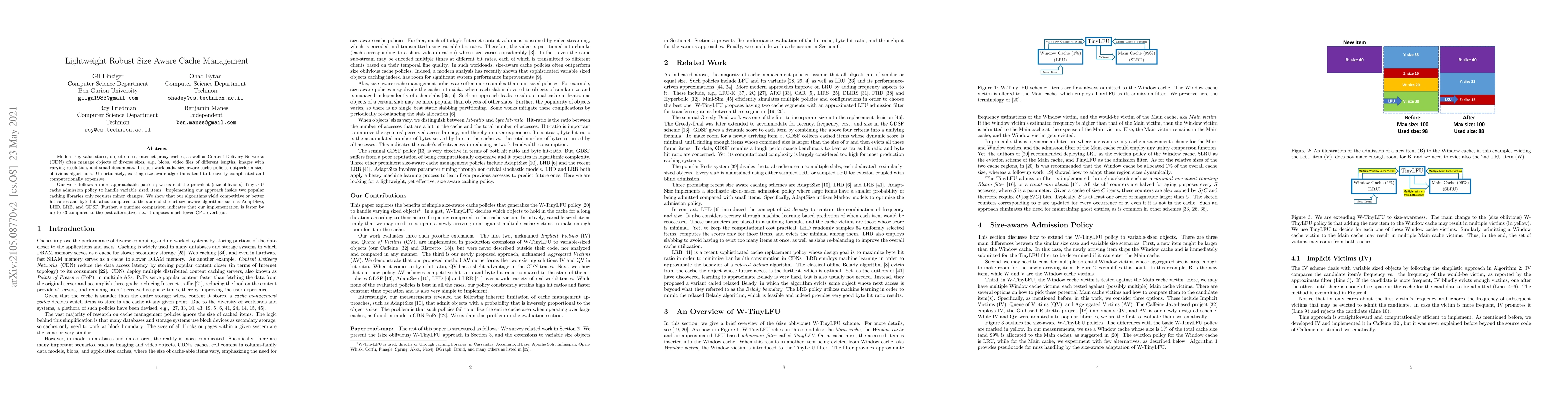 Modern key-value stores, object stores, Internet proxy caches, as well as Content Delivery Networks (CDN) often manage objects of diverse sizes, e.g., blobs, video files of different lengths, images with varying resolution, and small documents. In such workloads, size-aware cache policies outperform size-oblivious algorithms. Unfortunately, existing size-aware algorithms tend to be overly complicated and computationally~expensive. Our work follows a more approachable pattern; we extend the prevalent (size-oblivious) TinyLFU cache admission policy to handle variable sized items. Implementing our approach inside two popular caching libraries only requires minor changes. We show that our algorithms yield competitive or better hit-ratios and byte hit-ratios compared to the state of the art size-aware algorithms such as AdaptSize, LHD, LRB, and GDSF. Further, a runtime comparison indicates that our implementation is faster by up to x3 compared to the best alternative, i.e., it imposes much lower CPU overhead.