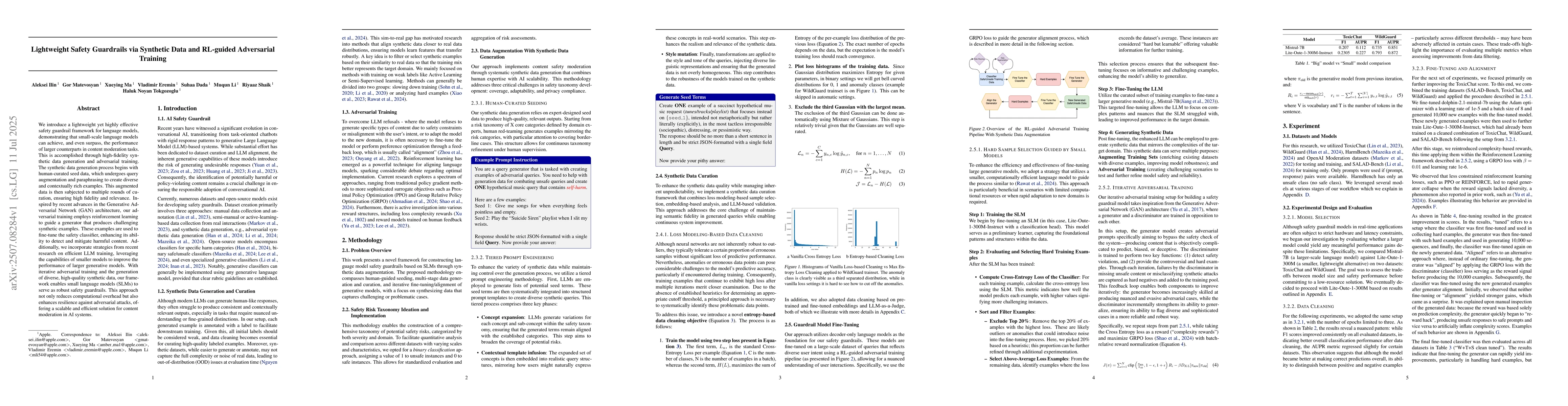 We introduce a lightweight yet highly effective safety guardrail framework for language models, demonstrating that small-scale language models can achieve, and even surpass, the performance of larger counterparts in content moderation tasks. This is accomplished through high-fidelity synthetic data generation and adversarial training. The synthetic data generation process begins with human-curated seed data, which undergoes query augmentation and paraphrasing to create diverse and contextually rich examples. This augmented data is then subjected to multiple rounds of curation, ensuring high fidelity and relevance. Inspired by recent advances in the Generative Adversarial Network (GAN) architecture, our adversarial training employs reinforcement learning to guide a generator that produces challenging synthetic examples. These examples are used to fine-tune the safety classifier, enhancing its ability to detect and mitigate harmful content. Additionally, we incorporate strategies from recent research on efficient LLM training, leveraging the capabilities of smaller models to improve the performance of larger generative models. With iterative adversarial training and the generation of diverse, high-quality synthetic data, our framework enables small language models (SLMs) to serve as robust safety guardrails. This approach not only reduces computational overhead but also enhances resilience against adversarial attacks, offering a scalable and efficient solution for content moderation in AI systems.