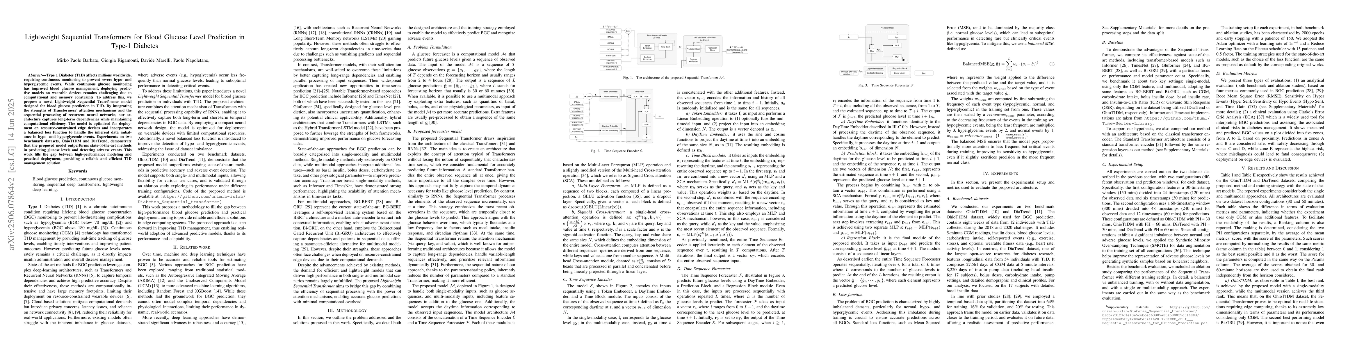 A novel Lightweight Sequential Transformer model is proposed for predicting blood glucose levels in Type-1 Diabetes, outperforming state-of-the-art methods on two benchmark datasets with high accuracy and computational efficiency.