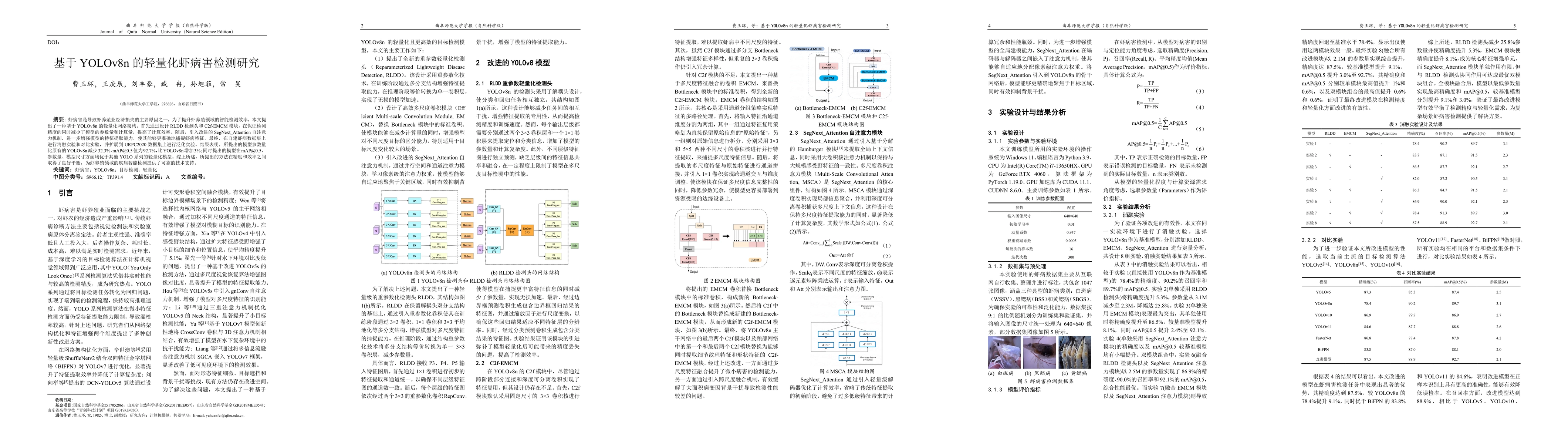 Shrimp diseases are one of the primary causes of economic losses in shrimp aquaculture. To prevent disease transmission and enhance intelligent detection efficiency in shrimp farming, this paper proposes a lightweight network architecture based on YOLOv8n. First, by designing the RLDD detection head and C2f-EMCM module, the model reduces computational complexity while maintaining detection accuracy, improving computational efficiency. Subsequently, an improved SegNext_Attention self-attention mechanism is introduced to further enhance the model's feature extraction capability, enabling more precise identification of disease characteristics. Extensive experiments, including ablation studies and comparative evaluations, are conducted on a self-constructed shrimp disease dataset, with generalization tests extended to the URPC2020 dataset. Results demonstrate that the proposed model achieves a 32.3% reduction in parameters compared to the original YOLOv8n, with a [email protected] of 92.7% (3% improvement over YOLOv8n). Additionally, the model outperforms other lightweight YOLO-series models in [email protected], parameter count, and model size. Generalization experiments on the URPC2020 dataset further validate the model's robustness, showing a 4.1% increase in [email protected] compared to YOLOv8n. The proposed method achieves an optimal balance between accuracy and efficiency, providing reliable technical support for intelligent disease detection in shrimp aquaculture.