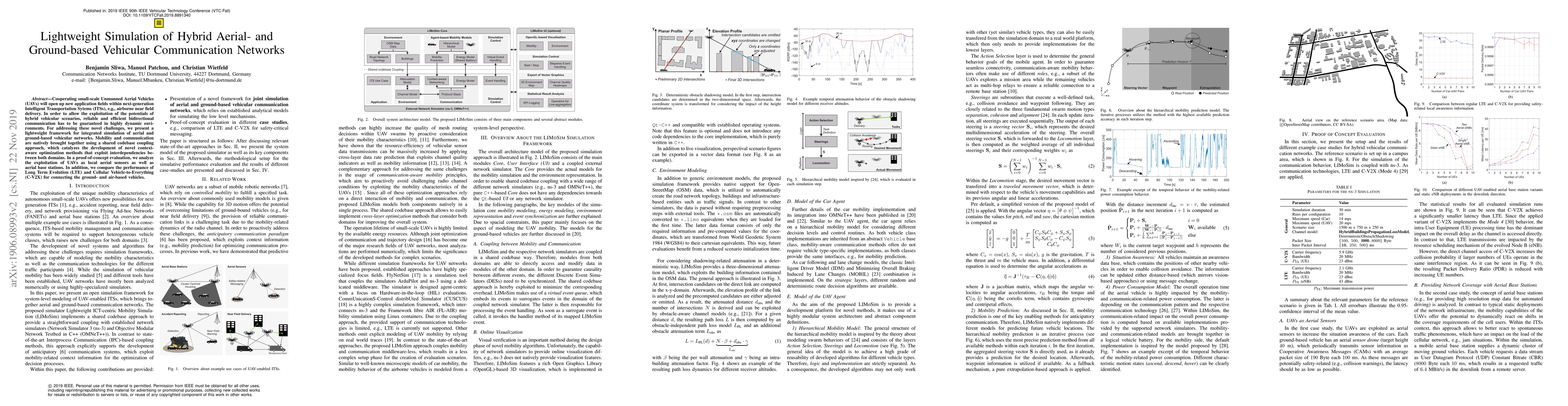This paper introduces a lightweight simulation framework for hybrid aerial and ground vehicular networks, focusing on the integration of UAVs in Intelligent Transportation Systems. The framework enables the analysis of UAVs as local sensors and base stations, and evaluates LTE and C-V2X for communication efficiency in dynamic environments.