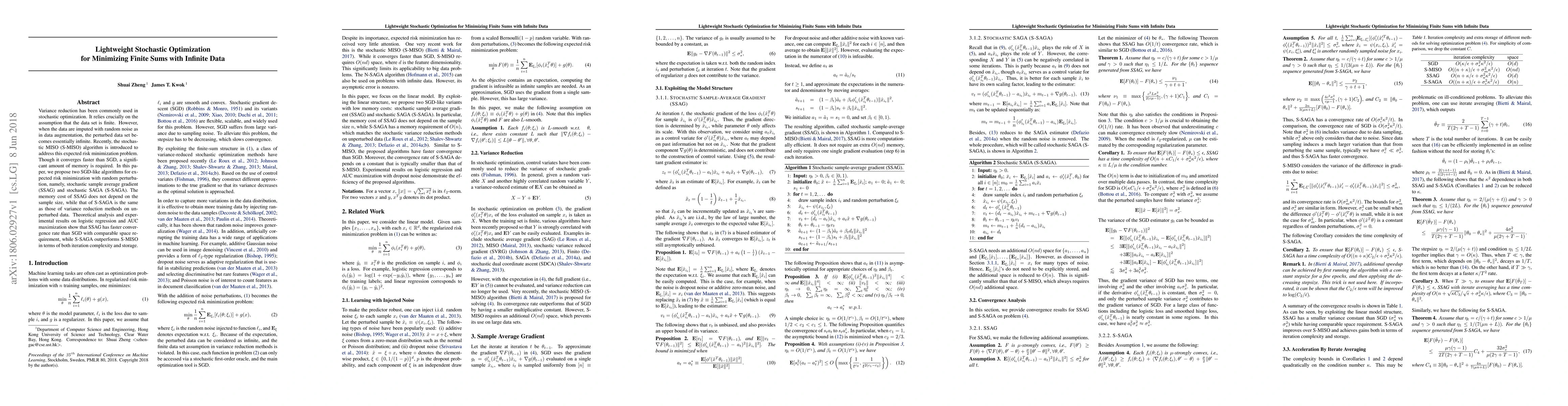 Two new SGD-like algorithms, SSAG and S-SAGA, are proposed to minimize finite sums with infinite data by using random perturbation, offering faster convergence rates and comparable storage requirements compared to traditional methods.