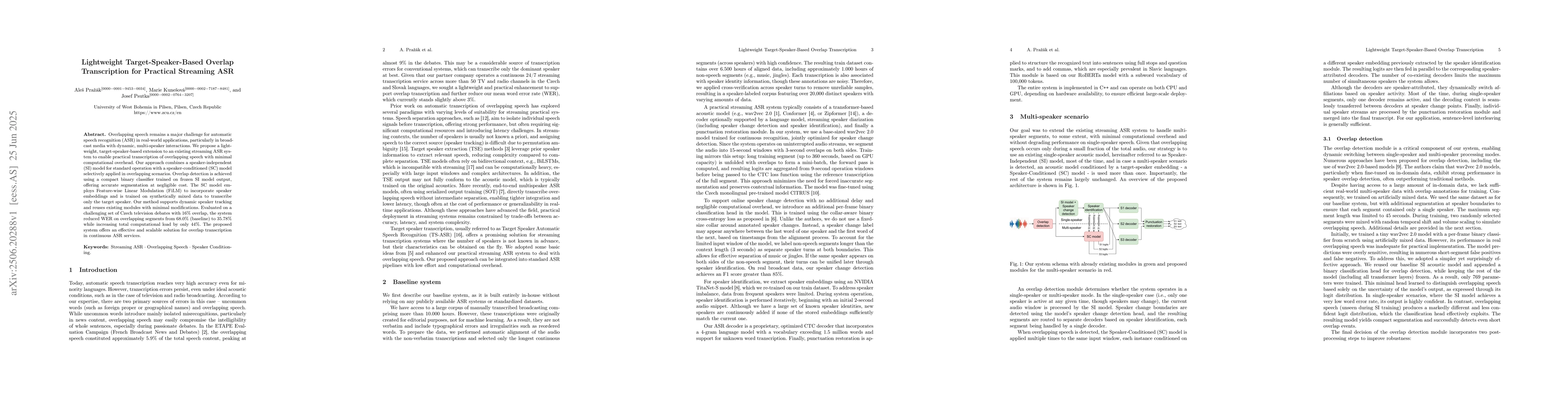 A practical streaming transcription architecture was proposed to handle over-lapping speech with minimal computational overhead.