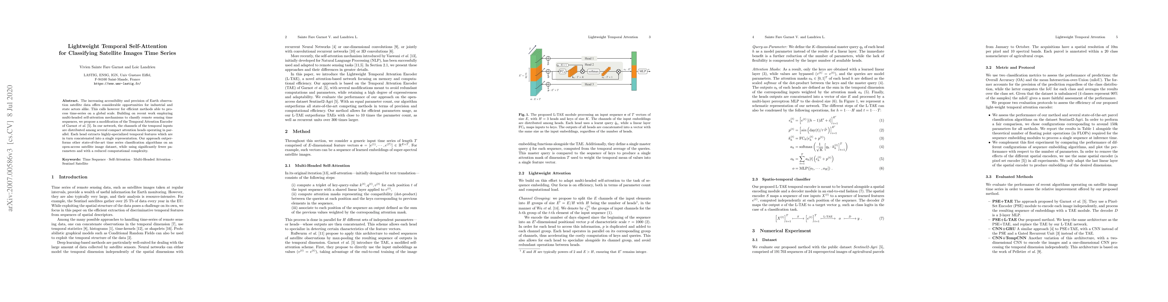 This paper proposes a lightweight temporal self-attention method for classifying satellite image time series, utilizing parallel compact attention heads to extract specialized temporal features. The approach achieves superior performance compared to other algorithms with fewer parameters and lower computational complexity.