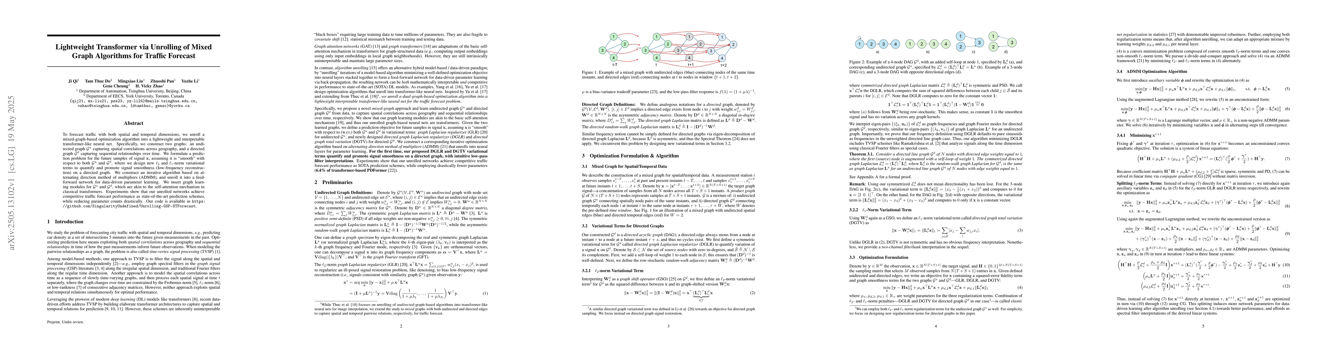 The research unrolls a mixed-graph-based optimization algorithm into a lightweight transformer-like neural network for traffic forecasting. It constructs undirected and directed graphs to capture spatial and temporal correlations, formulating a prediction problem with $\ell_2$ and $\ell_1$-norm variational terms for signal smoothness. An iterative algorithm based on ADMM is designed and transformed into a feed-forward network with graph learning modules for graph adjacency matrices, akin to self-attention mechanisms.