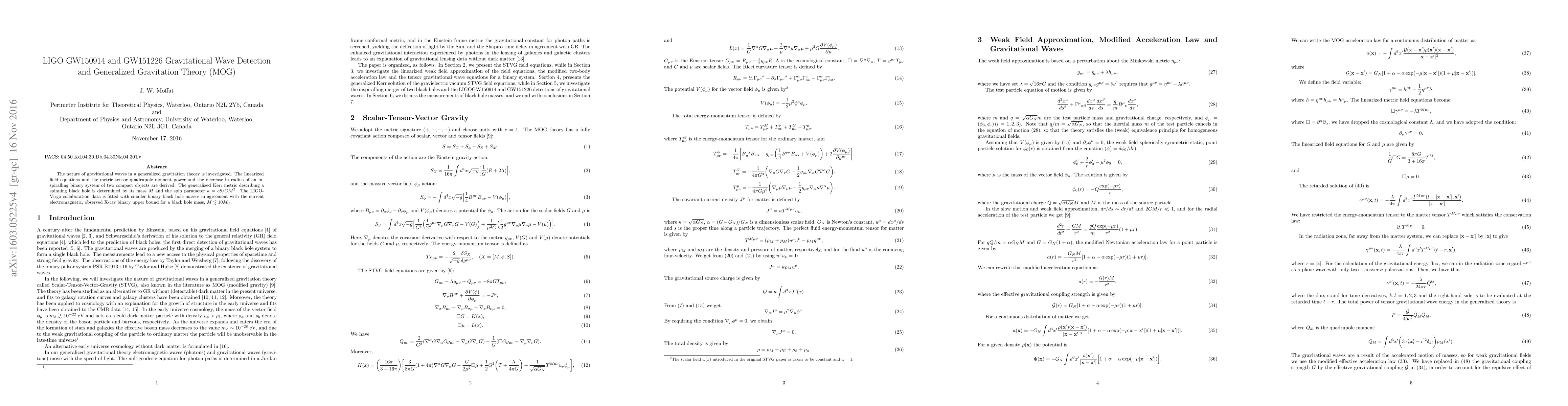 The nature of gravitational waves in a generalized gravitation theory is investigated. The linearized field equations and the metric tensor quadrupole moment power and the decrease in radius of an inspiralling binary system of two compact objects are derived. The generalized Kerr metric describing a spinning black hole is determined by its mass $M$ and the spin parameter $a=cS/GM^2$. The LIGO-Virgo collaboration data is fitted with smaller binary black hole masses in agreement with the current electromagnetic, observed X-ray binary upper bound for a black hole mass, $M\lesssim 10M_\odot$.