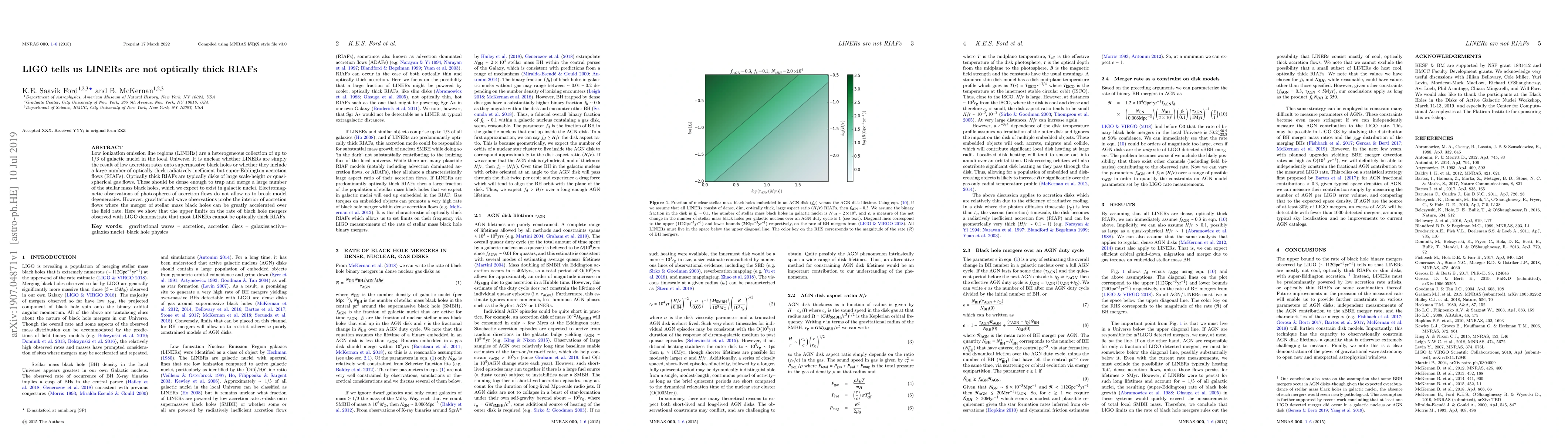 Low ionization emission line regions (LINERs) are a heterogeneous collection of up to $1/3$ of galactic nuclei in the local Universe. It is unclear whether LINERs are simply the result of low accretion rates onto supermassive black holes or whether they include a large number of optically thick radiatively inefficient but super-Eddington accretion flows (RIAFs). Optically thick RIAFs are typically disks of large scale-height or quasi-spherical gas flows. These should be dense enough to trap and merge a large number of the stellar mass black holes, which we expect to exist in galactic nuclei. Electromagnetic observations of photospheres of accretion flows do not allow us to break model degeneracies. However, gravitational wave observations probe the interior of accretion flows where the merger of stellar mass black holes can be greatly accelerated over the field rate. Here we show that the upper limits on the rate of black hole mergers observed with LIGO demonstrate that most LINERs cannot be optically thick RIAFs.