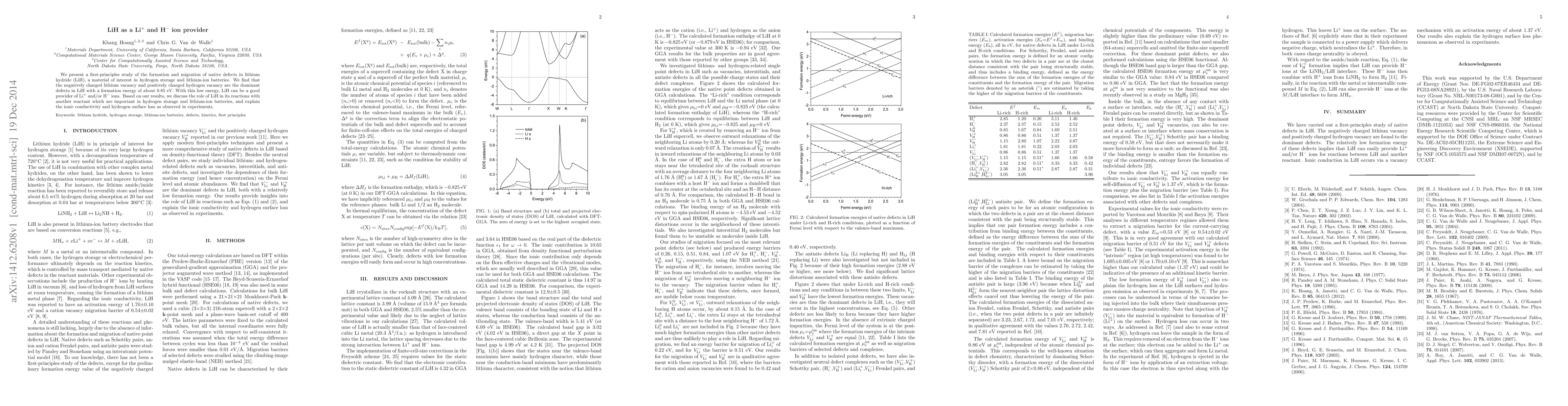 This study investigates native defects in lithium hydride (LiH), revealing that lithium and hydrogen vacancies are the dominant defects with low formation energy, making LiH a potential provider of Li$^+$ and H$^-$ ions. The findings explain LiH's role in reactions relevant to hydrogen storage and lithium-ion batteries, as well as observed ionic conductivity and hydrogen loss.
