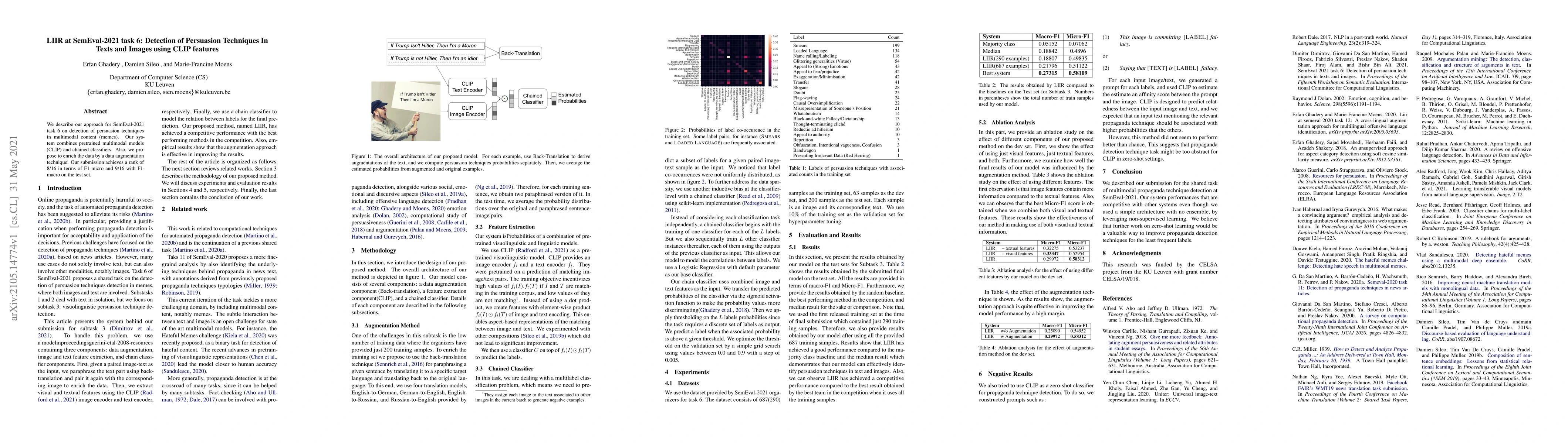 Researchers developed a system to detect persuasion techniques in texts and images using CLIP features, achieving a top 9 ranking in a competition with an F1-macro score of 91% on the test set.
