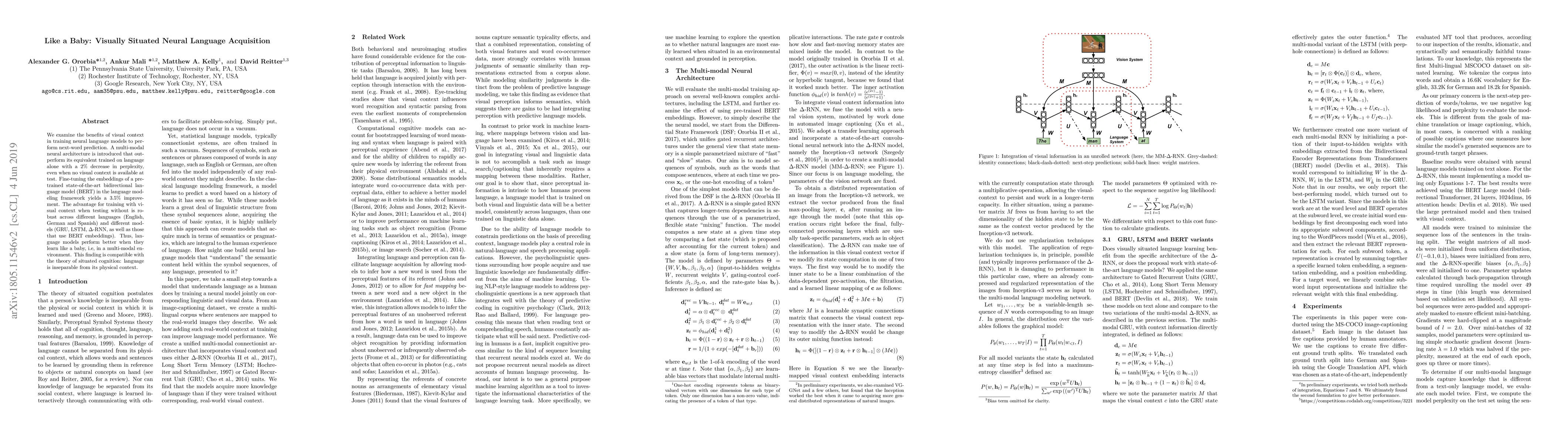 We examine the benefits of visual context in training neural language models to perform next-word prediction. A multi-modal neural architecture is introduced that outperform its equivalent trained on language alone with a 2\% decrease in perplexity, even when no visual context is available at test. Fine-tuning the embeddings of a pre-trained state-of-the-art bidirectional language model (BERT) in the language modeling framework yields a 3.5\% improvement. The advantage for training with visual context when testing without is robust across different languages (English, German and Spanish) and different models (GRU, LSTM, $\Delta$-RNN, as well as those that use BERT embeddings). Thus, language models perform better when they learn like a baby, i.e, in a multi-modal environment. This finding is compatible with the theory of situated cognition: language is inseparable from its physical context.