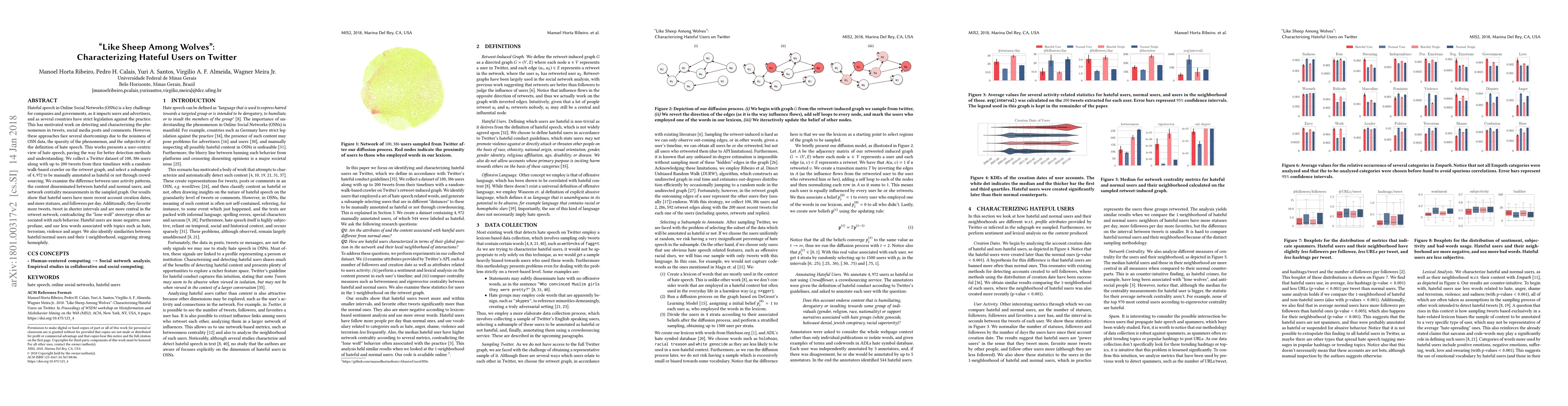 Hateful speech in Online Social Networks (OSNs) is a key challenge for companies and governments, as it impacts users and advertisers, and as several countries have strict legislation against the practice. This has motivated work on detecting and characterizing the phenomenon in tweets, social media posts and comments. However, these approaches face several shortcomings due to the noisiness of OSN data, the sparsity of the phenomenon, and the subjectivity of the definition of hate speech. This works presents a user-centric view of hate speech, paving the way for better detection methods and understanding. We collect a Twitter dataset of $100,386$ users along with up to $200$ tweets from their timelines with a random-walk-based crawler on the retweet graph, and select a subsample of $4,972$ to be manually annotated as hateful or not through crowdsourcing. We examine the difference between user activity patterns, the content disseminated between hateful and normal users, and network centrality measurements in the sampled graph. Our results show that hateful users have more recent account creation dates, and more statuses, and followees per day. Additionally, they favorite more tweets, tweet in shorter intervals and are more central in the retweet network, contradicting the "lone wolf" stereotype often associated with such behavior. Hateful users are more negative, more profane, and use less words associated with topics such as hate, terrorism, violence and anger. We also identify similarities between hateful/normal users and their 1-neighborhood, suggesting strong homophily.