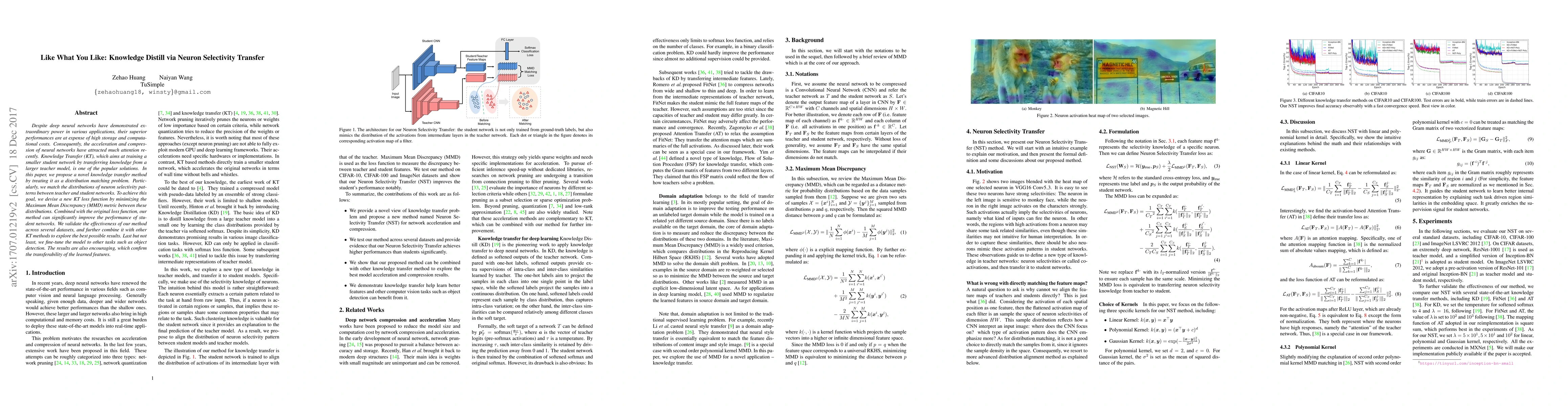 This paper proposes a novel knowledge transfer method that matches neuron selectivity patterns between teacher and student networks, using a new loss function based on the Maximum Mean Discrepancy metric. The method improves student network performance and shows transferability to other tasks like object detection.