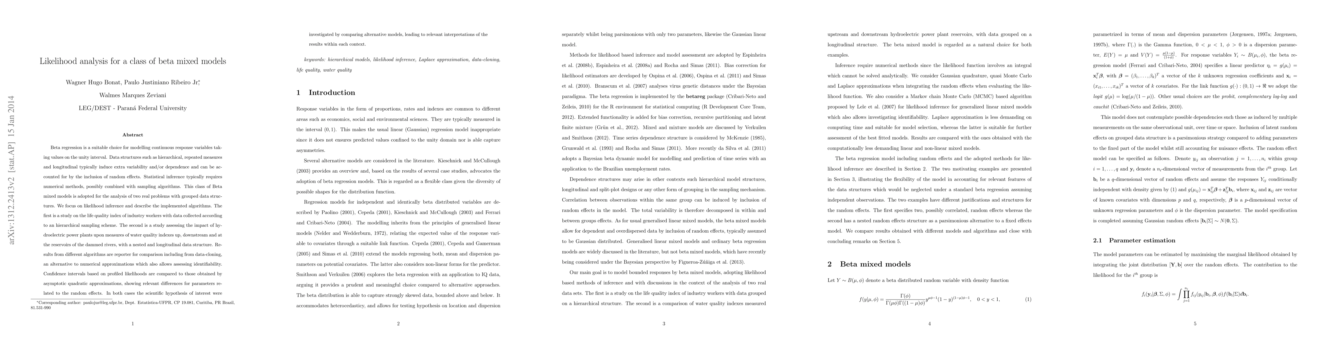 Beta regression models are a suitable choice for continuous response variables on the unity interval. Random effects add further flexibility to the models and accommodate data structures such as hierarchical, repeated measures and longitudinal, which typically induce extra variability and/or dependence. Closed expressions cannot be obtained for parameter estimation and numerical methods are required and possibly combined with sampling algorithms. We focus on likelihood inference and related algorithms for the analysis of beta mixed models motivated by two real problems with grouped data structures. The first is a study on a life quality index of industry workers with data collected according to an hierarchical sampling scheme. The second is a study with a nested and longitudinal data structure assessing the impact of hydroelectric power plants upon measures of water quality indexes up, downstream and at the reservoirs of the dammed rivers. Relevant scientific hypothesis are investigated by comparing alternative models. The analysis uses different algorithms including data-cloning, an alternative to numerical approximations which also assess identifiability. Confidence intervals based on profiled likelihoods are compared to those obtained by asymptotic quadratic approximations, showing relevant differences for parameters related to the random effects.