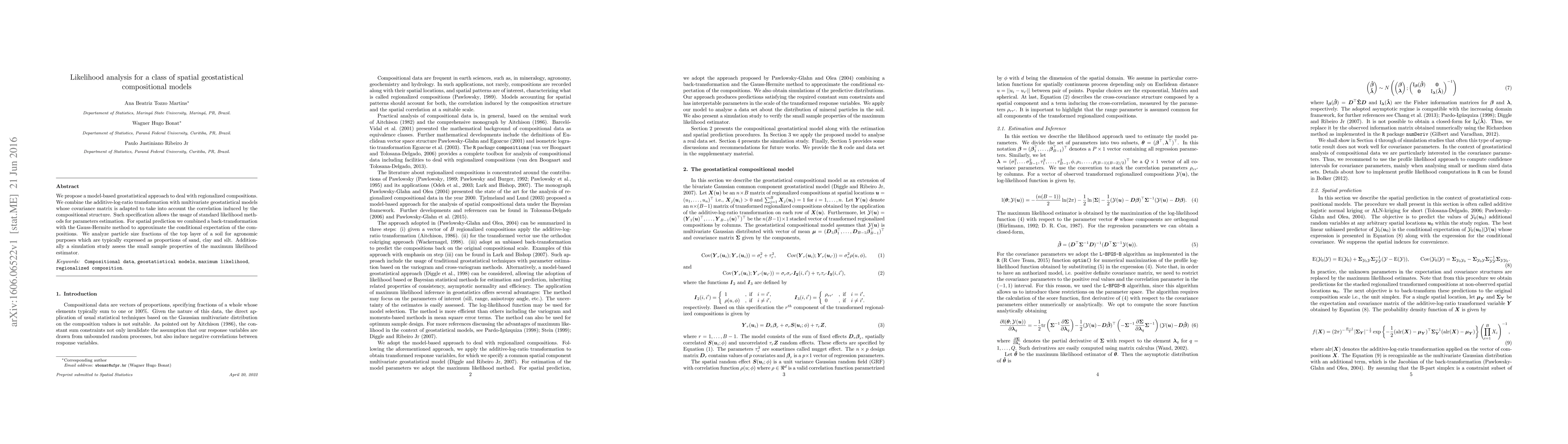 This paper proposes a geostatistical model for regionalized compositional data, combining the additive-log-ratio transformation with adapted multivariate geostatistical models for parameter estimation using likelihood methods. It applies the model to predict soil particle size fractions and assesses the estimator's small sample properties through simulation.