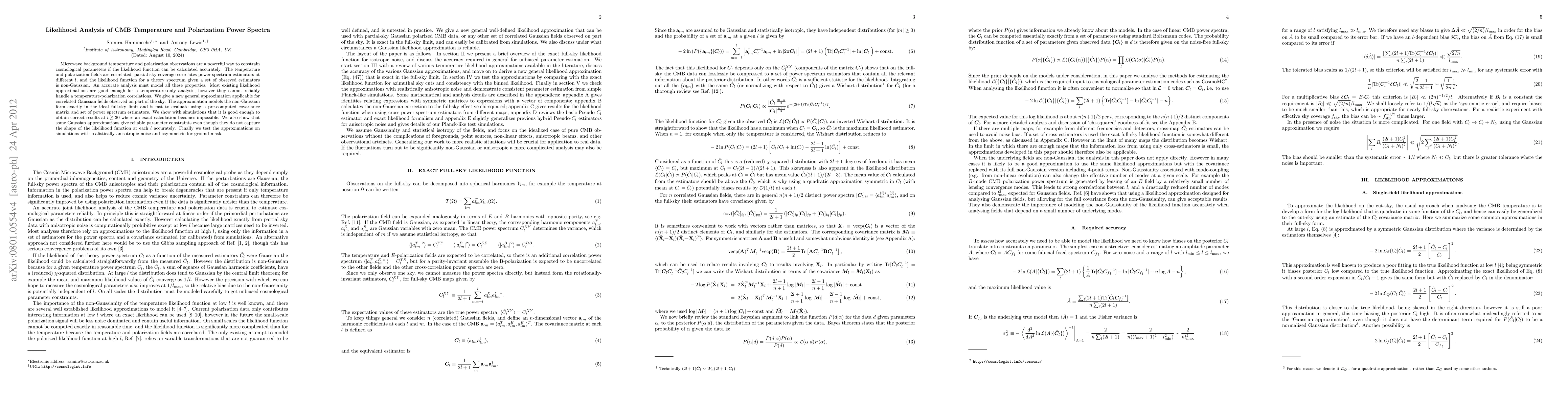 This paper presents a new approximation for the likelihood function in the analysis of CMB temperature and polarization power spectra, addressing the challenges of non-Gaussianity, partial sky coverage, and correlations. The proposed method accurately models these properties and is shown to be effective for parameter constraints in simulations.
