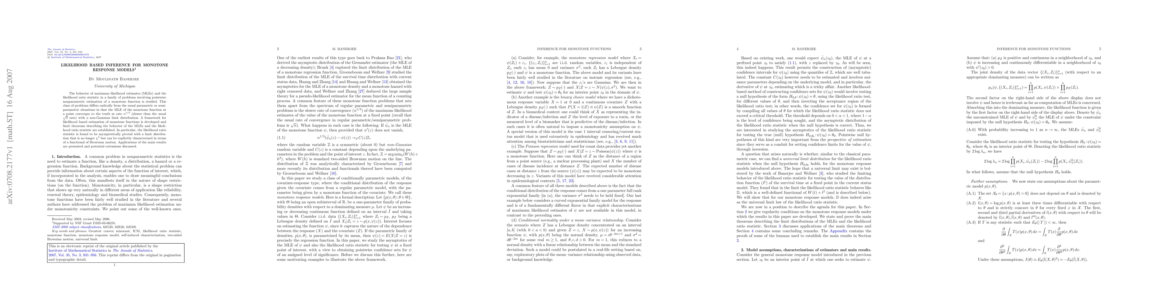This paper studies the behavior of maximum likelihood estimates in monotone response models, revealing that the convergence rate is $n^{1/3}$ with a non-Gaussian limit distribution, unlike the usual $\sqrt{n}$ rate. It develops a framework for likelihood-based inference and characterizes the likelihood ratio statistic's distribution as a functional of Brownian motion.