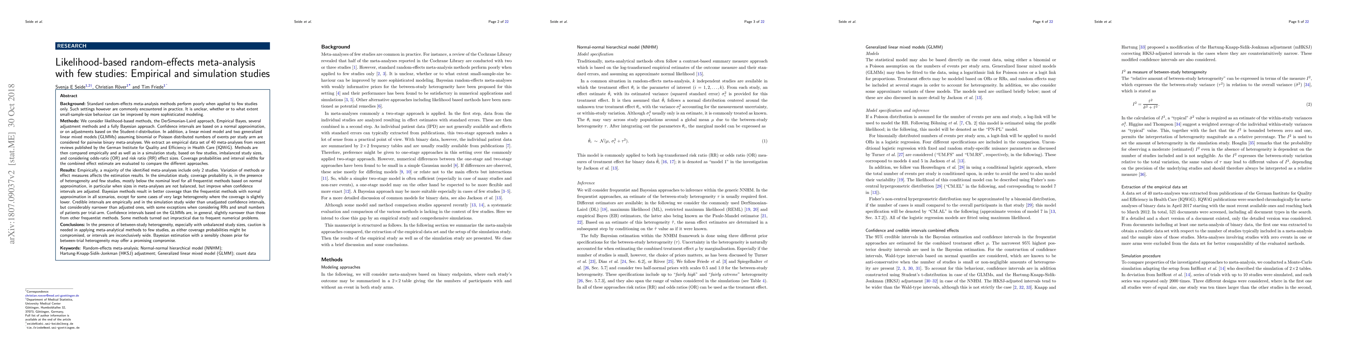 This paper investigates likelihood-based methods for meta-analysis in settings with few studies, comparing empirical and simulation results. It finds that frequentist methods based on normal approximations often fail to maintain coverage probabilities, especially in the presence of heterogeneity and unbalanced study sizes, while Bayesian methods generally perform better.