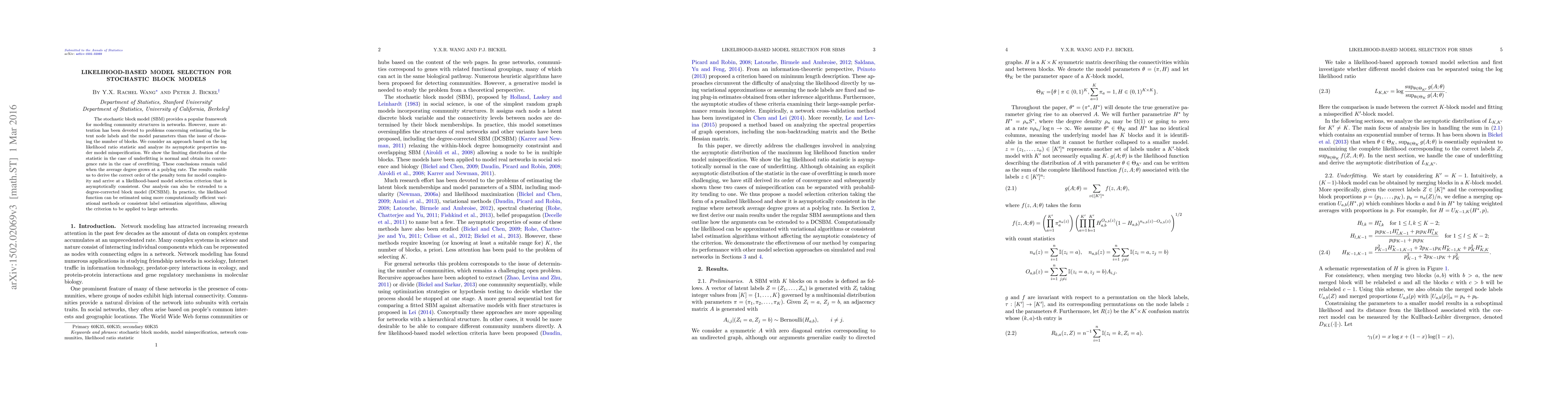 This paper develops a likelihood-based criterion for selecting the optimal number of blocks in stochastic block models, showing its asymptotic consistency and normal limiting distribution under underfitting. The method is also applicable to degree-corrected block models and can be implemented using efficient variational techniques for large networks.