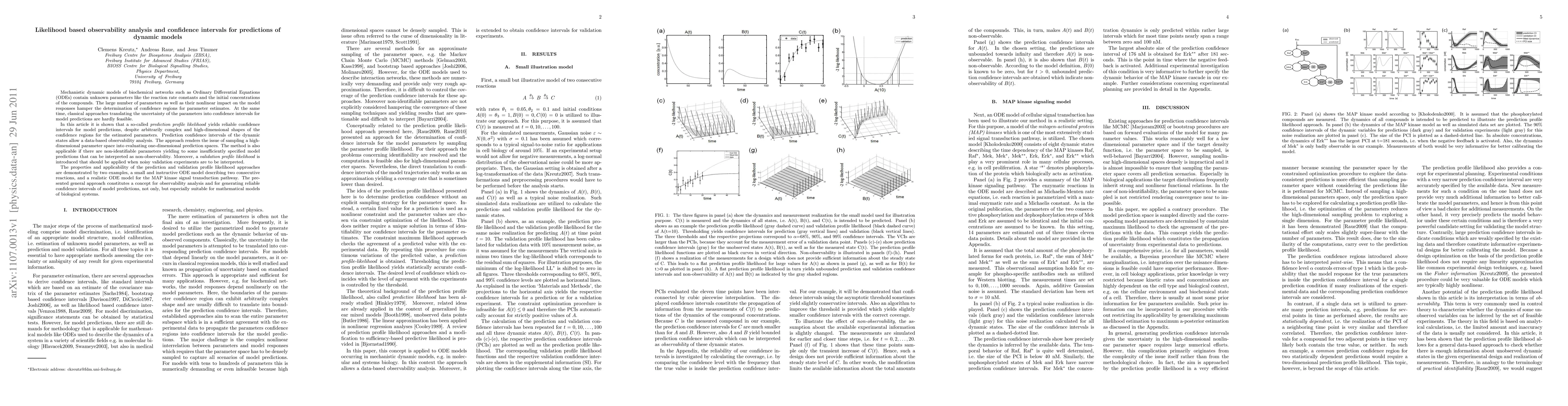 Mechanistic dynamic models of biochemical networks such as Ordinary Differential Equations (ODEs) contain unknown parameters like the reaction rate constants and the initial concentrations of the compounds. The large number of parameters as well as their nonlinear impact on the model responses hamper the determination of confidence regions for parameter estimates. At the same time, classical approaches translating the uncertainty of the parameters into confidence intervals for model predictions are hardly feasible. In this article it is shown that a so-called prediction profile likelihood yields reliable confidence intervals for model predictions, despite arbitrarily complex and high-dimensional shapes of the confidence regions for the estimated parameters. Prediction confidence intervals of the dynamic states allow a data-based observability analysis. The approach renders the issue of sampling a high-dimensional parameter space into evaluating one-dimensional prediction spaces. The method is also applicable if there are non-identifiable parameters yielding to some insufficiently specified model predictions that can be interpreted as non-observability. Moreover, a validation profile likelihood is introduced that should be applied when noisy validation experiments are to be interpreted. The properties and applicability of the prediction and validation profile likelihood approaches are demonstrated by two examples, a small and instructive ODE model describing two consecutive reactions, and a realistic ODE model for the MAP kinase signal transduction pathway. The presented general approach constitutes a concept for observability analysis and for generating reliable confidence intervals of model predictions, not only, but especially suitable for mathematical models of biological systems.