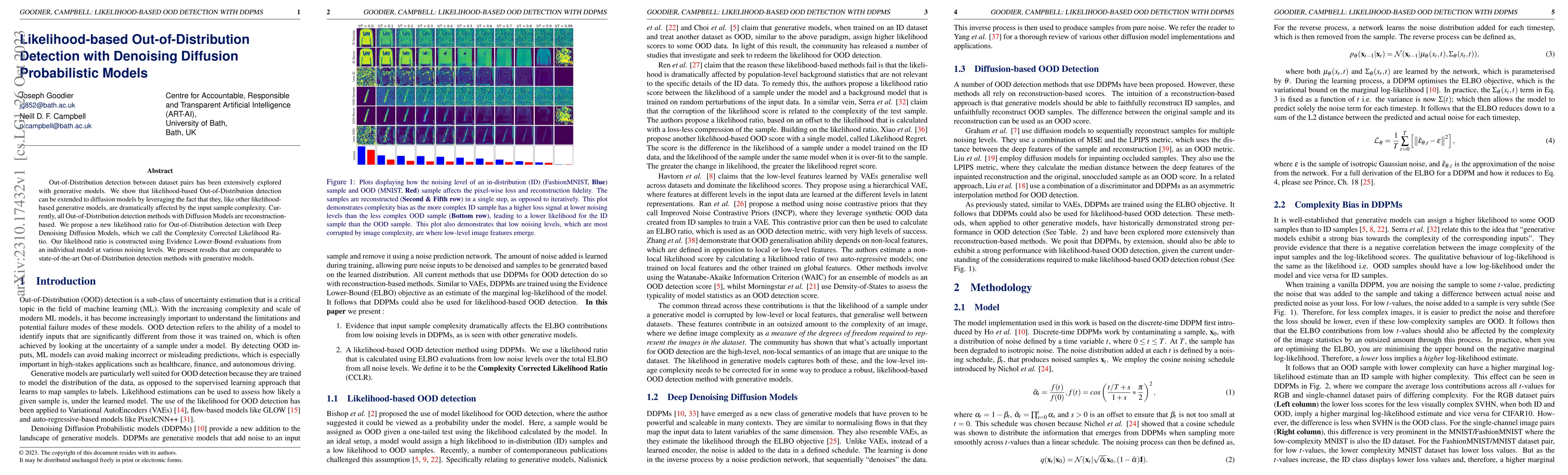 This paper proposes a new likelihood ratio method for out-of-distribution detection using Deep Denoising Diffusion Probabilistic Models, termed the Complexity Corrected Likelihood Ratio, which outperforms existing reconstruction-based methods. The method leverages Evidence Lower-Bound evaluations at different noise levels.