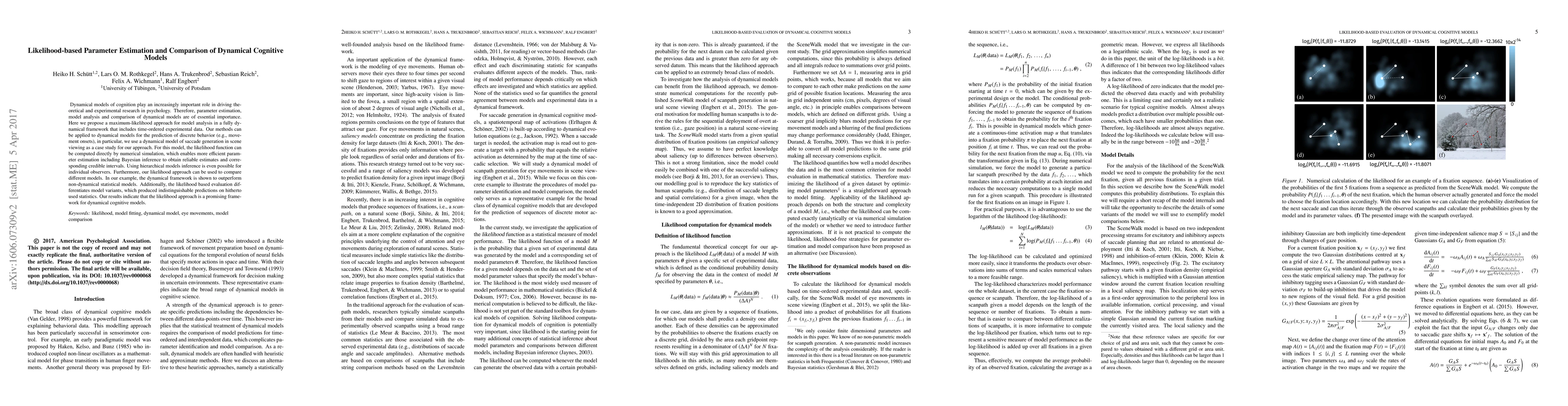 Dynamical models of cognition play an increasingly important role in driving theoretical and experimental research in psychology. Therefore, parameter estimation, model analysis and comparison of dynamical models are of essential importance. Here we propose a maximum-likelihood approach for model analysis in a fully dynamical framework that includes time-ordered experimental data. Our methods can be applied to dynamical models for the prediction of discrete behavior (e.g., movement onsets), in particular, we use a dynamical model of saccade generation in scene viewing as a case study for our approach. For this model, the likelihood function can be computed directly by numerical simulation, which enables more efficient parameter estimation including Bayesian inference to obtain reliable estimates and corresponding credible intervals. Using hierarchical models inference is even possible for individual observers. Furthermore, our likelihood approach can be used to compare different models. In our example, the dynamical framework is shown to outperform non-dynamical statistical models. Additionally, the likelihood based evaluation differentiates model variants, which produced indistinguishable predictions on hitherto used statistics. Our results indicate that the likelihood approach is a promising framework for dynamical cognitive models.