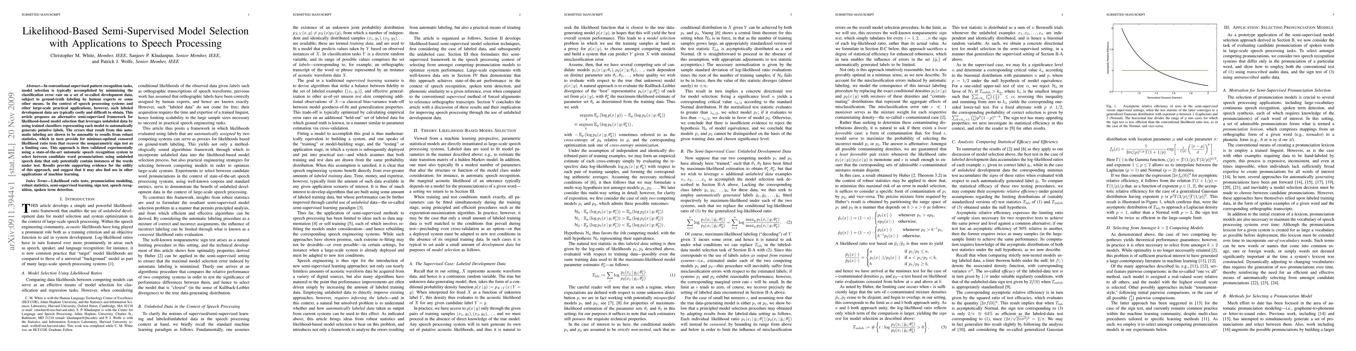 Researchers propose a semi-supervised model selection method that uses unlabeled data to automatically generate labels, enabling efficient model selection in speech processing systems without requiring costly labeled development data.