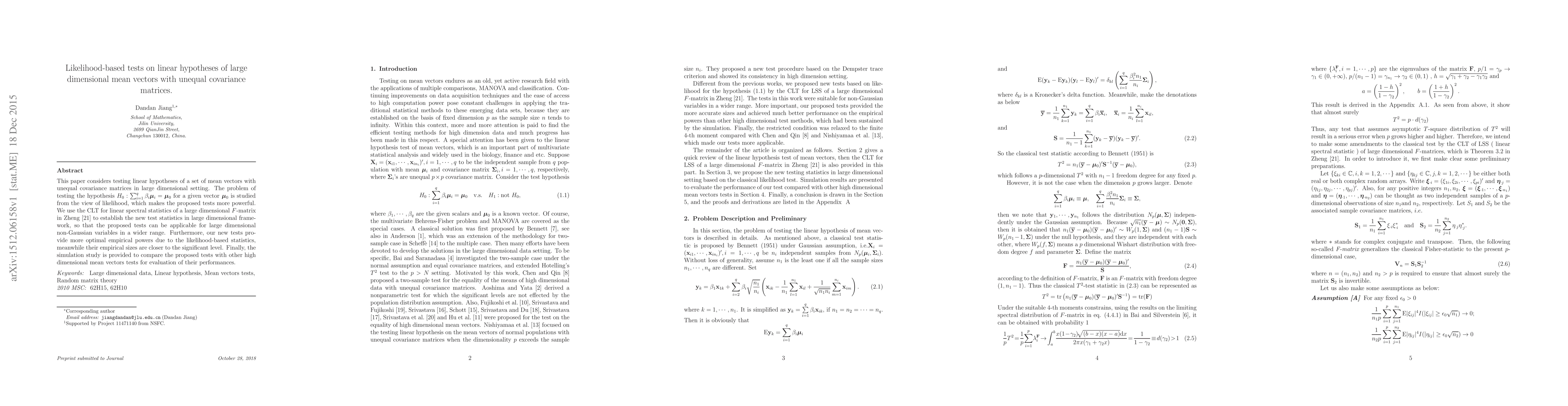 This paper proposes likelihood-based tests for linear hypotheses on large dimensional mean vectors with unequal covariance matrices, leveraging the CLT for linear spectral statistics to enhance test power and accuracy. Simulation results show improved empirical powers and size control compared to existing methods.