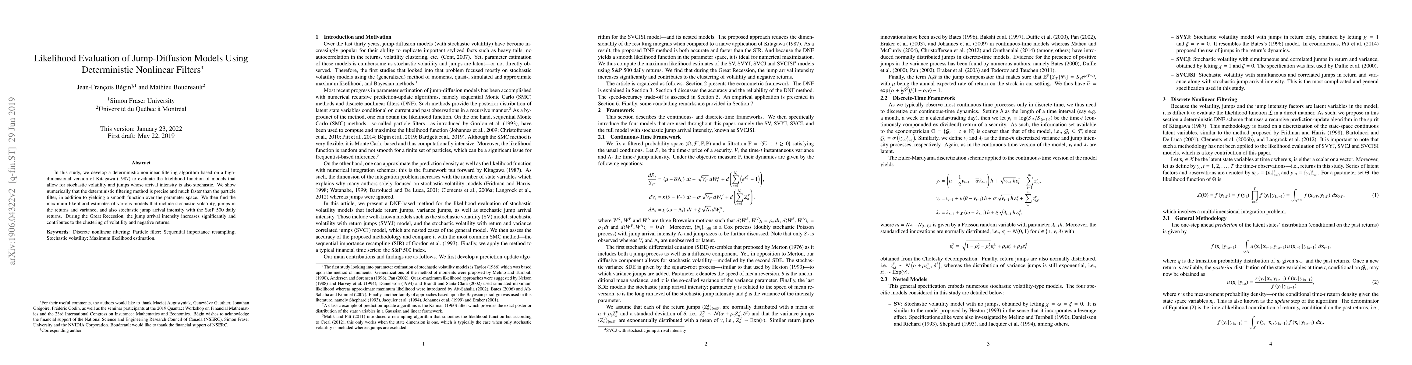 In this study, we develop a deterministic nonlinear filtering algorithm based on a high-dimensional version of Kitagawa (1987) to evaluate the likelihood function of models that allow for stochastic volatility and jumps whose arrival intensity is also stochastic. We show numerically that the deterministic filtering method is precise and much faster than the particle filter, in addition to yielding a smooth function over the parameter space. We then find the maximum likelihood estimates of various models that include stochastic volatility, jumps in the returns and variance, and also stochastic jump arrival intensity with the S&P 500 daily returns. During the Great Recession, the jump arrival intensity increases significantly and contributes to the clustering of volatility and negative returns.