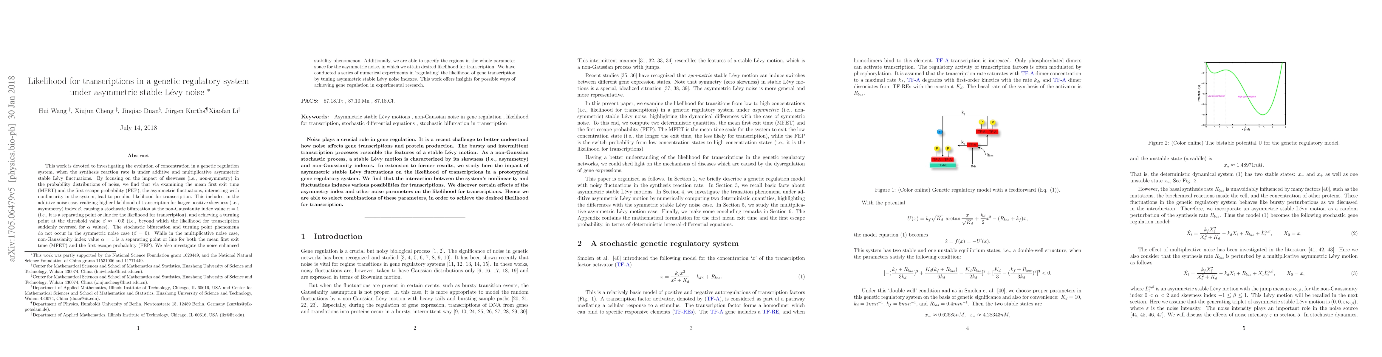 This work is devoted to investigating the evolution of concentration in a genetic regulation system, when the synthesis reaction rate is under additive and multiplicative asymmetric stable L\'evy fluctuations. By focusing on the impact of skewness (i.e., non-symmetry) in the probability distributions of noise, we find that via examining the mean first exit time (MFET) and the first escape probability (FEP), the asymmetric fluctuations, interacting with nonlinearity in the system, lead to peculiar likelihood for transcription. This includes, in the additive noise case, realizing higher likelihood of transcription for larger positive skewness (i.e., asymmetry) index $\beta$, causing a stochastic bifurcation at the non-Gaussianity index value $\alpha=1$ (i.e., it is a separating point or line for the likelihood for transcription), and achieving a turning point at the threshold value $\beta \approx -0.5$ (i.e., beyond which the likelihood for transcription suddenly reversed for $\alpha$ values). The stochastic bifurcation and turning point phenomena do not occur in the symmetric noise case ($\beta =0$). While in the multiplicative noise case, non-Gaussianity index value $\alpha=1$ is a separating point or line for both the mean first exit time (MFET) and the first escape probability (FEP). We also investigate the noise enhanced stability phenomenon. Additionally, we are able to specify the regions in the whole parameter space for the asymmetric noise, in which we attain desired likelihood for transcription. We have conducted a series of numerical experiments in `regulating' the likelihood of gene transcription by tuning asymmetric stable L\'evy noise indexes. This work offers insights for possible ways of achieving gene regulation in experimental research.