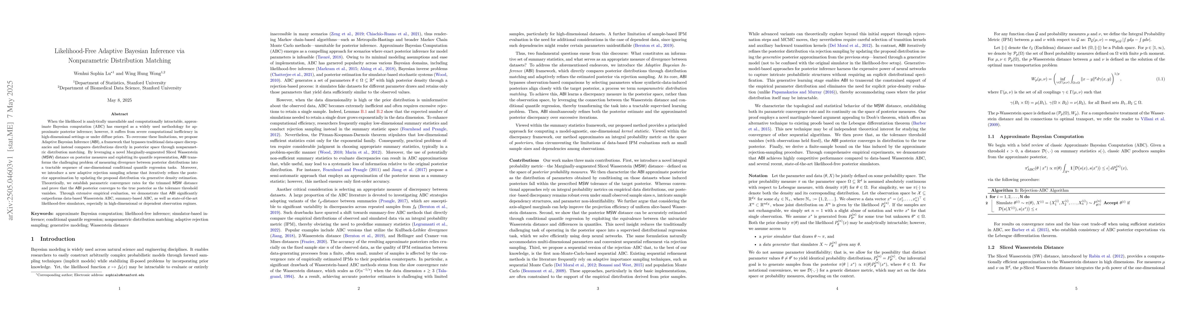 This paper proposes Adaptive Bayesian Inference (ABI) to address computational inefficiencies in high-dimensional settings for approximate Bayesian computation (ABC) by using nonparametric distribution matching. ABI leverages a Marginally-augmented Sliced Wasserstein distance and adaptive rejection sampling to efficiently approximate posterior distributions.