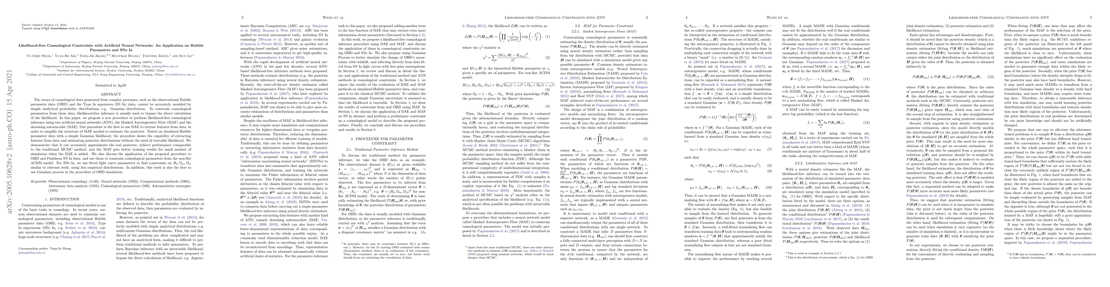This paper proposes a novel likelihood-free inference method using artificial neural networks to constrain cosmological parameters from complex data like Hubble parameters and Type Ia supernovae. The method employs a Masked Autoregressive Flow and a denoising autoencoder to extract features and estimate posterior distributions without requiring a tractable likelihood function, demonstrating comparable performance to traditional MCMC methods.