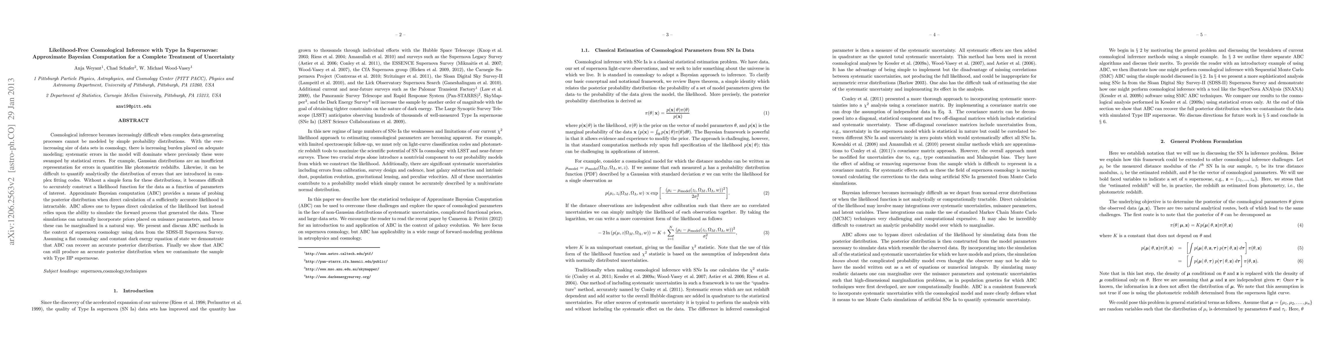 Cosmological inference becomes increasingly difficult when complex data-generating processes cannot be modeled by simple probability distributions. With the ever-increasing size of data sets in cosmology, there is increasing burden placed on adequate modeling; systematic errors in the model will dominate where previously these were swamped by statistical errors. For example, Gaussian distributions are an insufficient representation for errors in quantities like photometric redshifts. Likewise, it can be difficult to quantify analytically the distribution of errors that are introduced in complex fitting codes. Without a simple form for these distributions, it becomes difficult to accurately construct a likelihood function for the data as a function of parameters of interest. Approximate Bayesian computation (ABC) provides a means of probing the posterior distribution when direct calculation of a sufficiently accurate likelihood is intractable. ABC allows one to bypass direct calculation of the likelihood but instead relies upon the ability to simulate the forward process that generated the data. These simulations can naturally incorporate priors placed on nuisance parameters, and hence these can be marginalized in a natural way. We present and discuss ABC methods in the context of supernova cosmology using data from the SDSS-II Supernova Survey. Assuming a flat cosmology and constant dark energy equation of state we demonstrate that ABC can recover an accurate posterior distribution. Finally we show that ABC can still produce an accurate posterior distribution when we contaminate the sample with Type IIP supernovae.