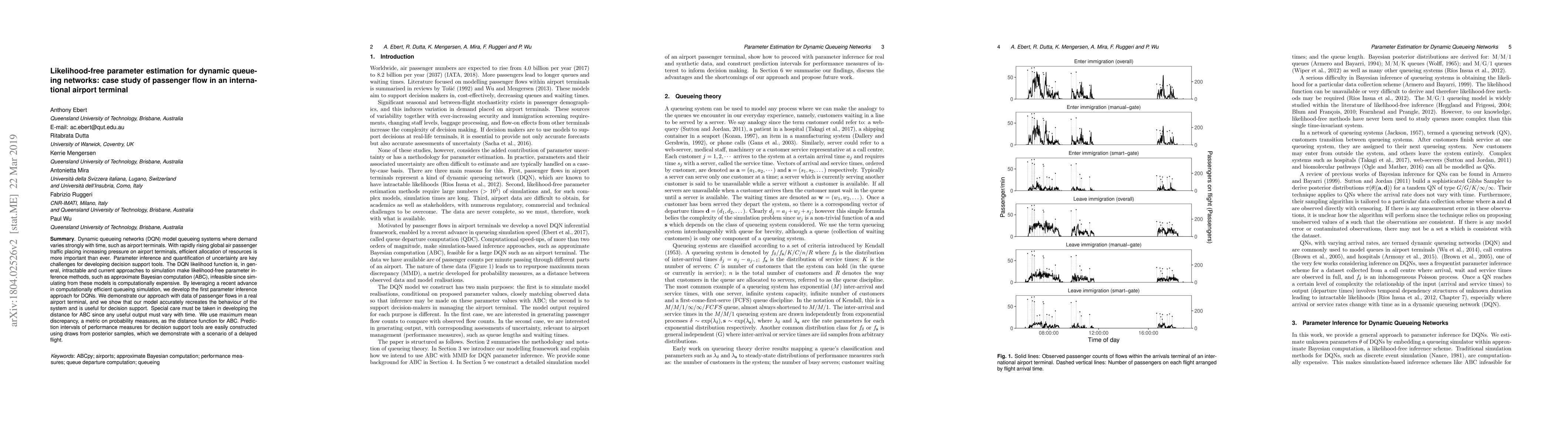 Dynamic queueing networks (DQN) model queueing systems where demand varies strongly with time, such as airport terminals. With rapidly rising global air passenger traffic placing increasing pressure on airport terminals, efficient allocation of resources is more important than ever. Parameter inference and quantification of uncertainty are key challenges for developing decision support tools. The DQN likelihood function is, in general, intractable and current approaches to simulation make likelihood-free parameter inference methods, such as approximate Bayesian computation (ABC), infeasible since simulating from these models is computationally expensive. By leveraging a recent advance in computationally efficient queueing simulation, we develop the first parameter inference approach for DQNs. We demonstrate our approach with data of passenger flows in a real airport terminal, and we show that our model accurately recreates the behaviour of the system and is useful for decision support. Special care must be taken in developing the distance for ABC since any useful output must vary with time. We use maximum mean discrepancy, a metric on probability measures, as the distance function for ABC. Prediction intervals of performance measures for decision support tools are easily constructed using draws from posterior samples, which we demonstrate with a scenario of a delayed flight.